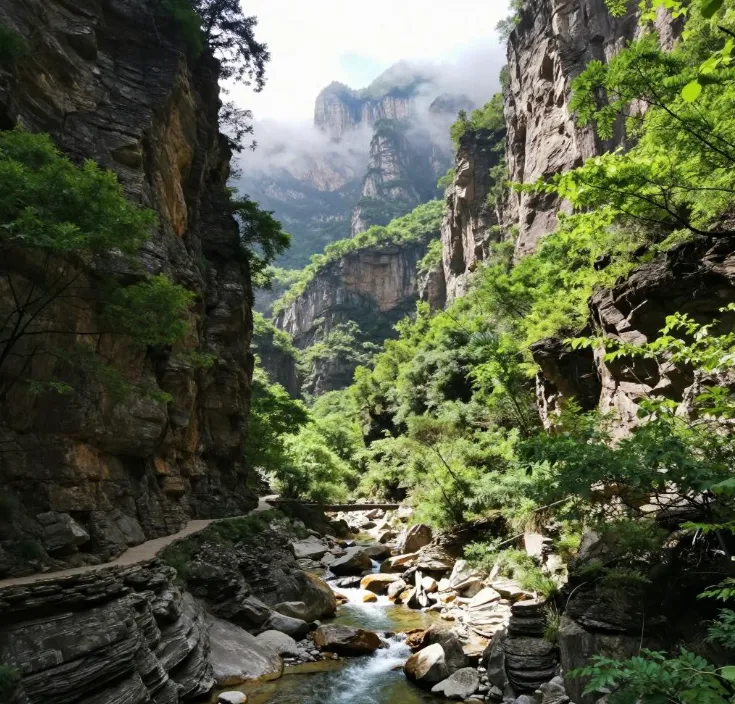 海棠峪:一線天、爽心瀑,左侧野葡萄藤洞可捕捉丁达尔光束与水雾同框的梦幻画面