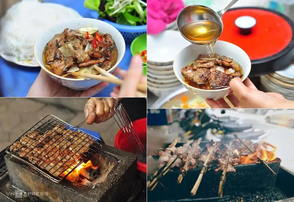 烤肉米线,通常是午餐吃的食物。与越南中部和南部的烤猪肉米线相似,但河内人的烤肉腌料更加讲究。喜欢古早味道的人可以去行马和行铜街的烤肉米线店。喜欢竹签烤肉米线的,那就找簸箕市场、同春市场。或者去玉庆、讲武、黎文兴、行棉街的米线店,也都是河内有名气的店铺。