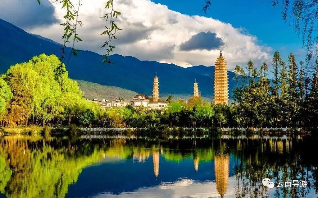 崇圣寺三塔是大理国时期的皇家寺院,已有1200多年历史,是大理的标志性建筑。主塔千寻塔高69.6米,两座小塔相伴而立,造型独特。从三塔倒影公园拍摄三塔倒影是经典机位。