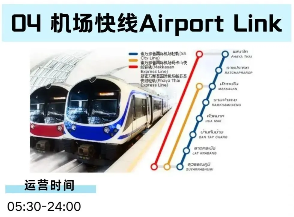 红色 SA特快专线(Airport Express Line):与蓝色线完全重合但可以一站直达Makkasan站,大约耗时15分钟,每20分钟一趟。