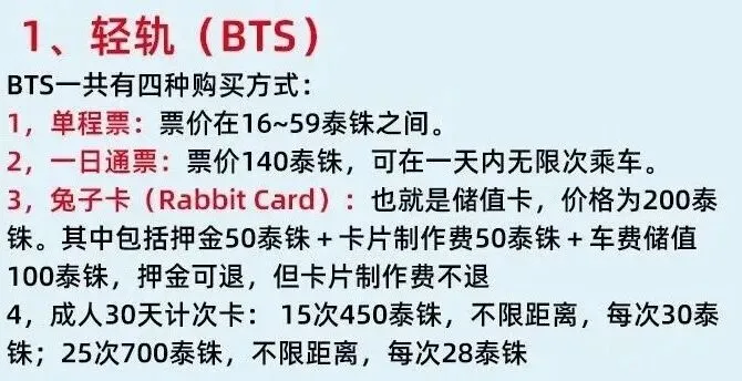 注意:值得注意的是,BTS轻轨的车票不能与MRT地铁共享,也不能无缝换乘。
