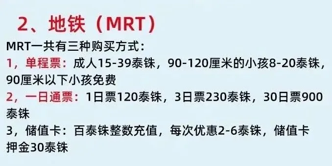 票价:根据行程距离计算,单程票价格从16泰铢(约1站)到62泰铢(封顶价)