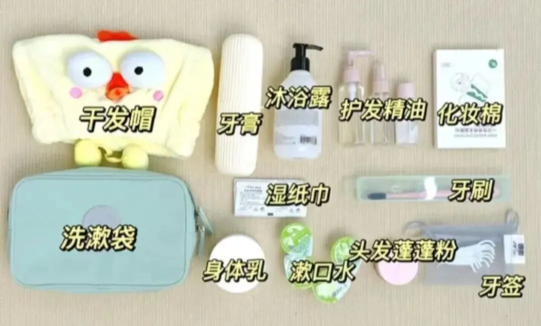 ✅️ 洗发水、护发素、沐浴露、身体乳、卷发棒、梳子镜子、发圈发带、干湿纸巾、毛巾、干发帽