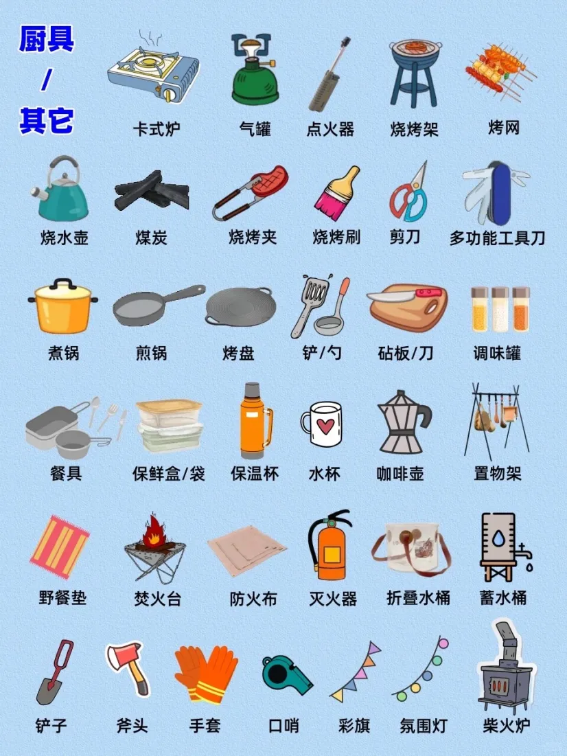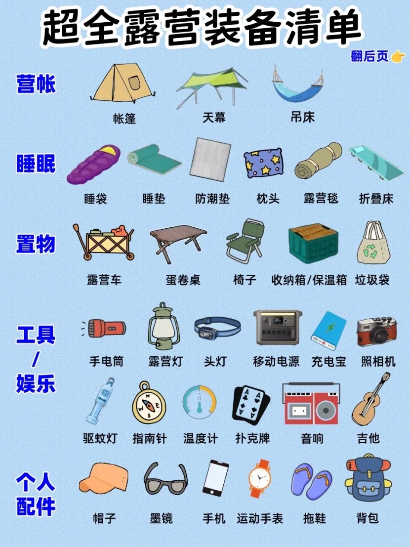 ✅️ 如果是户外野营,那么食物、水、睡袋、帐篷、防潮垫、雨衣、照明设备这些是必备的