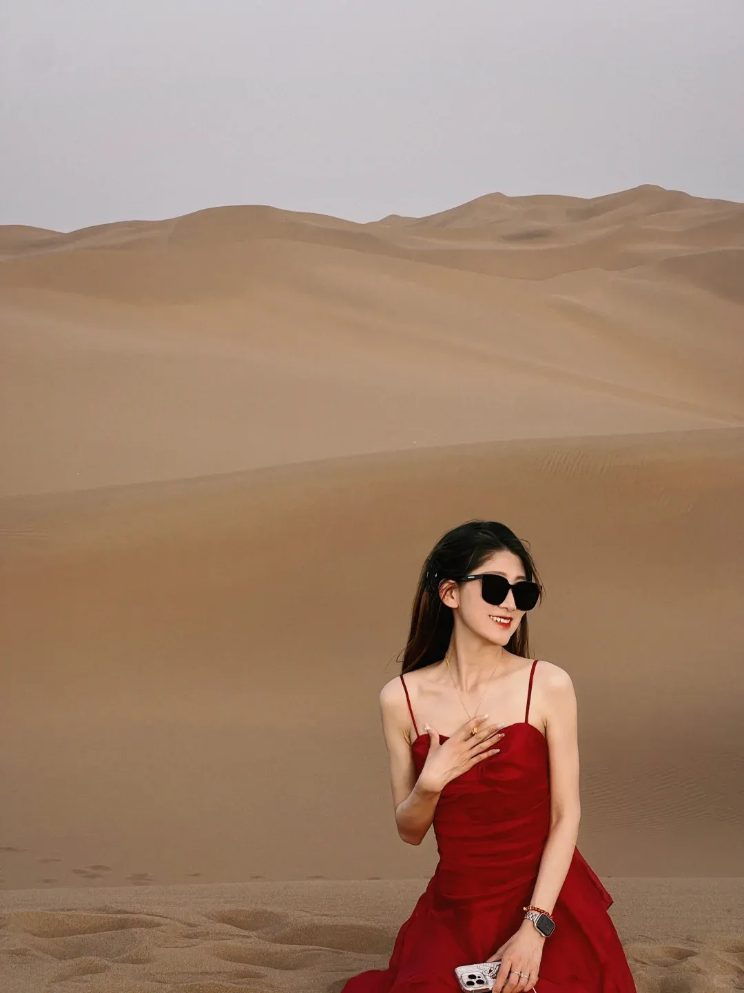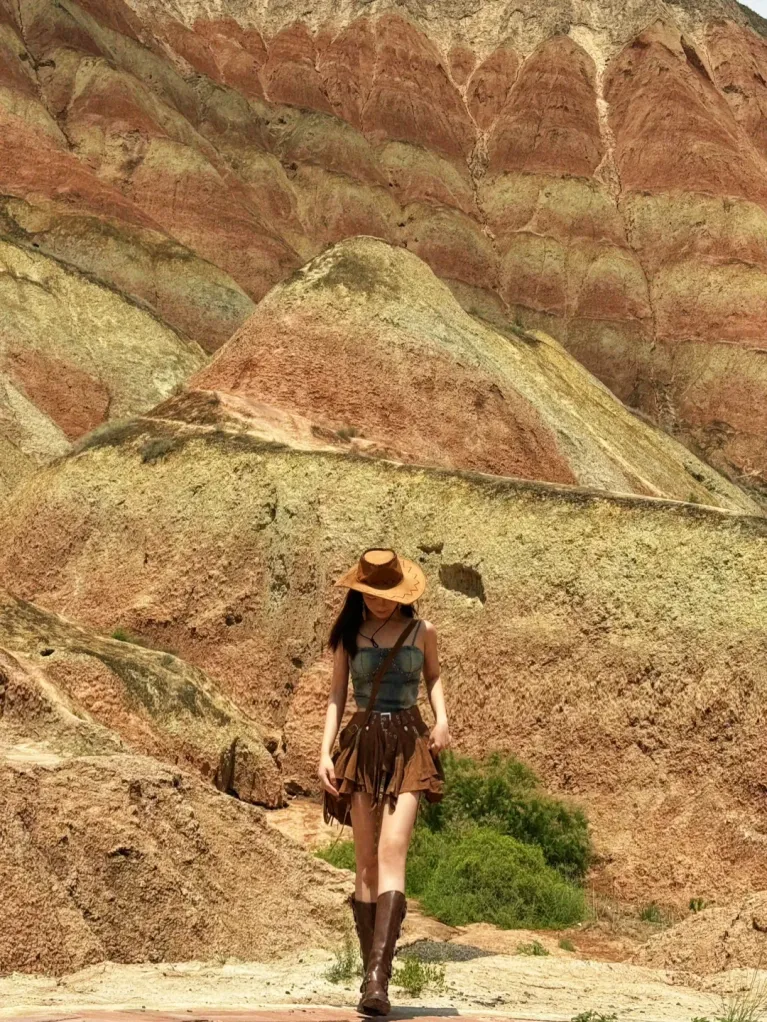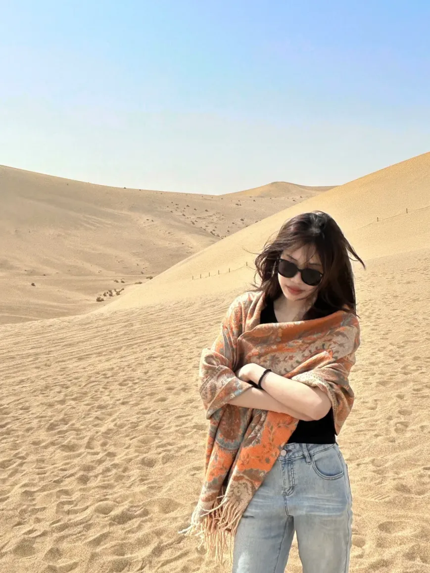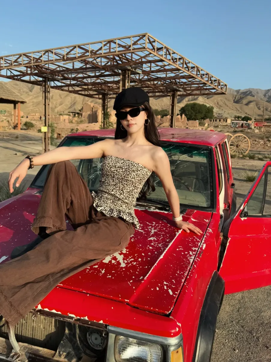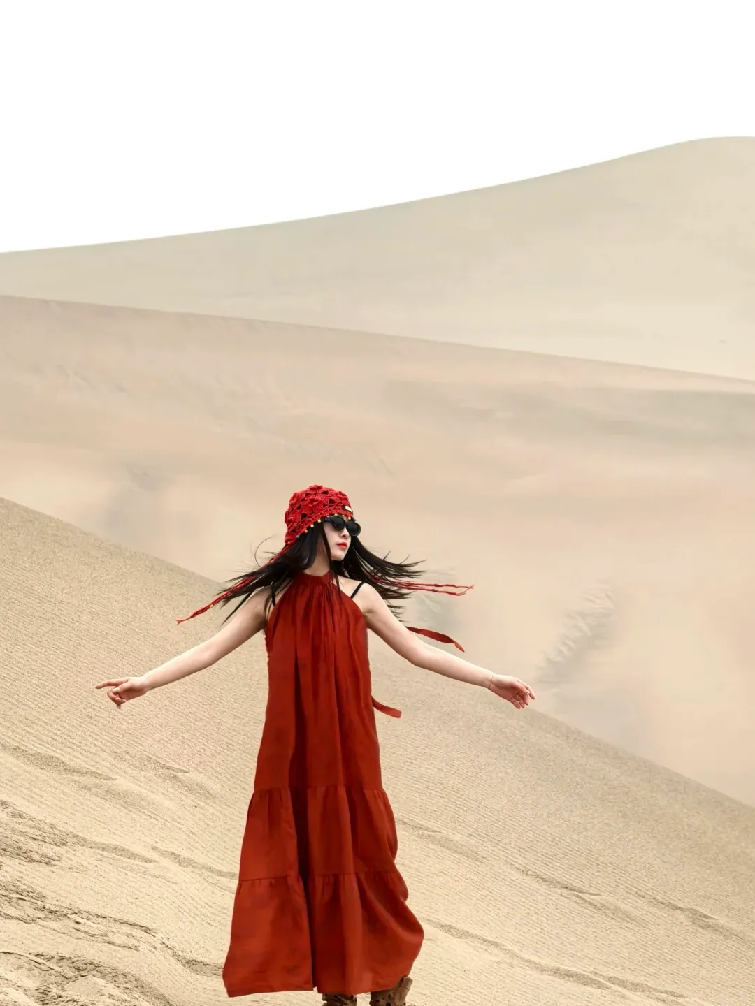 正红、铁锈红、赭石、南瓜橘,这是沙漠穿搭最经典也最出片的颜色。万顷黄沙里一点红,就是最原始的生命力