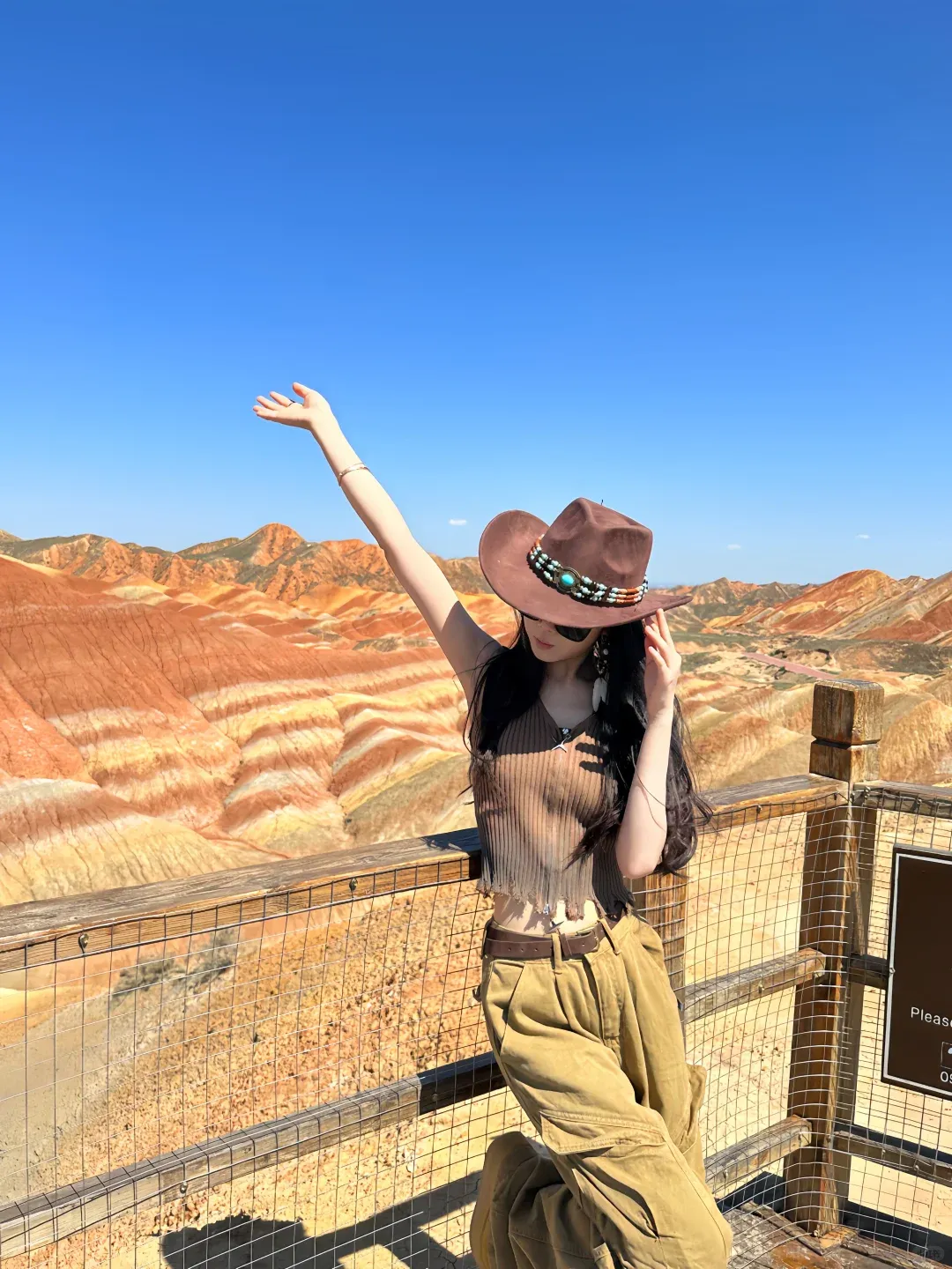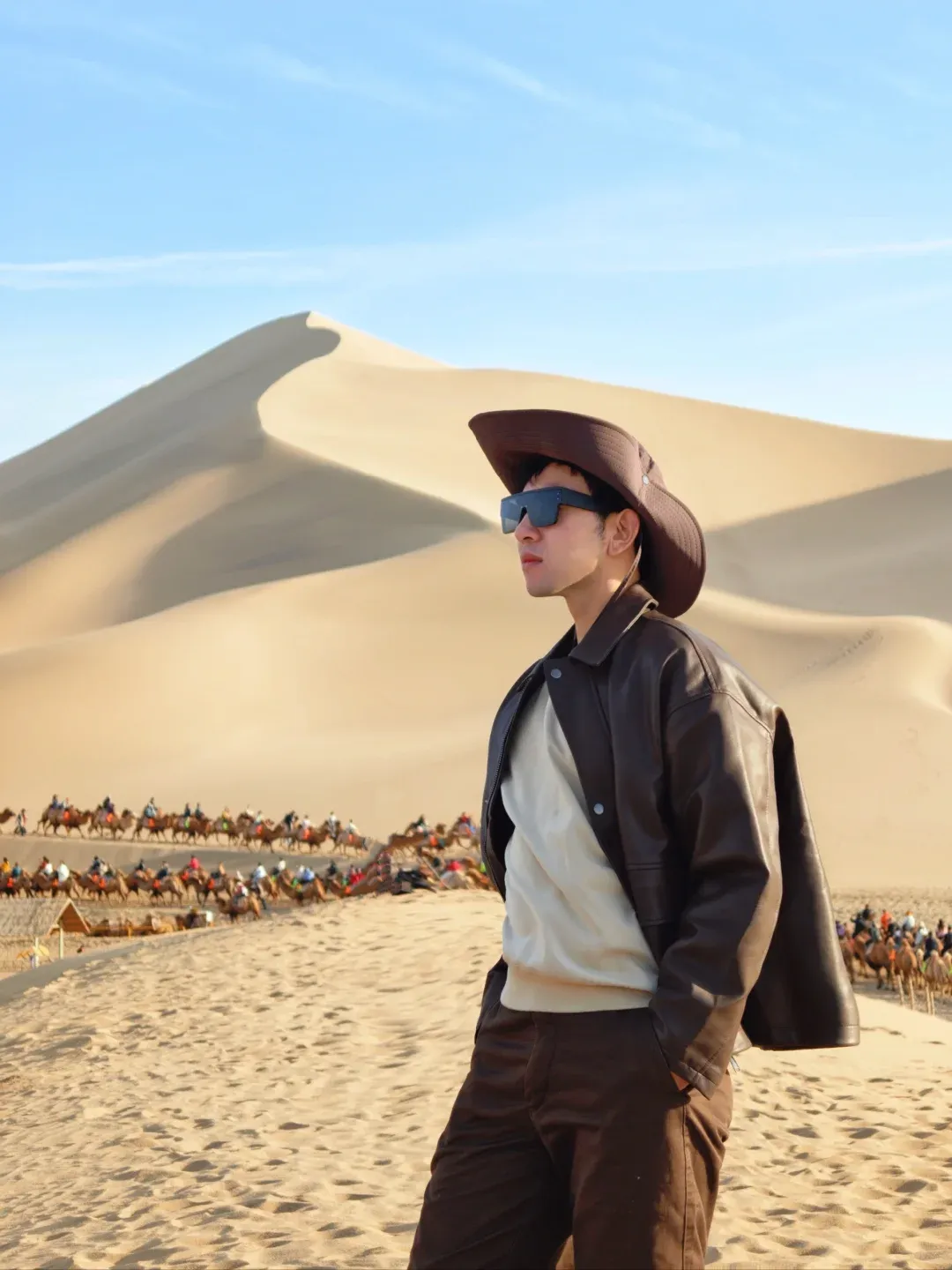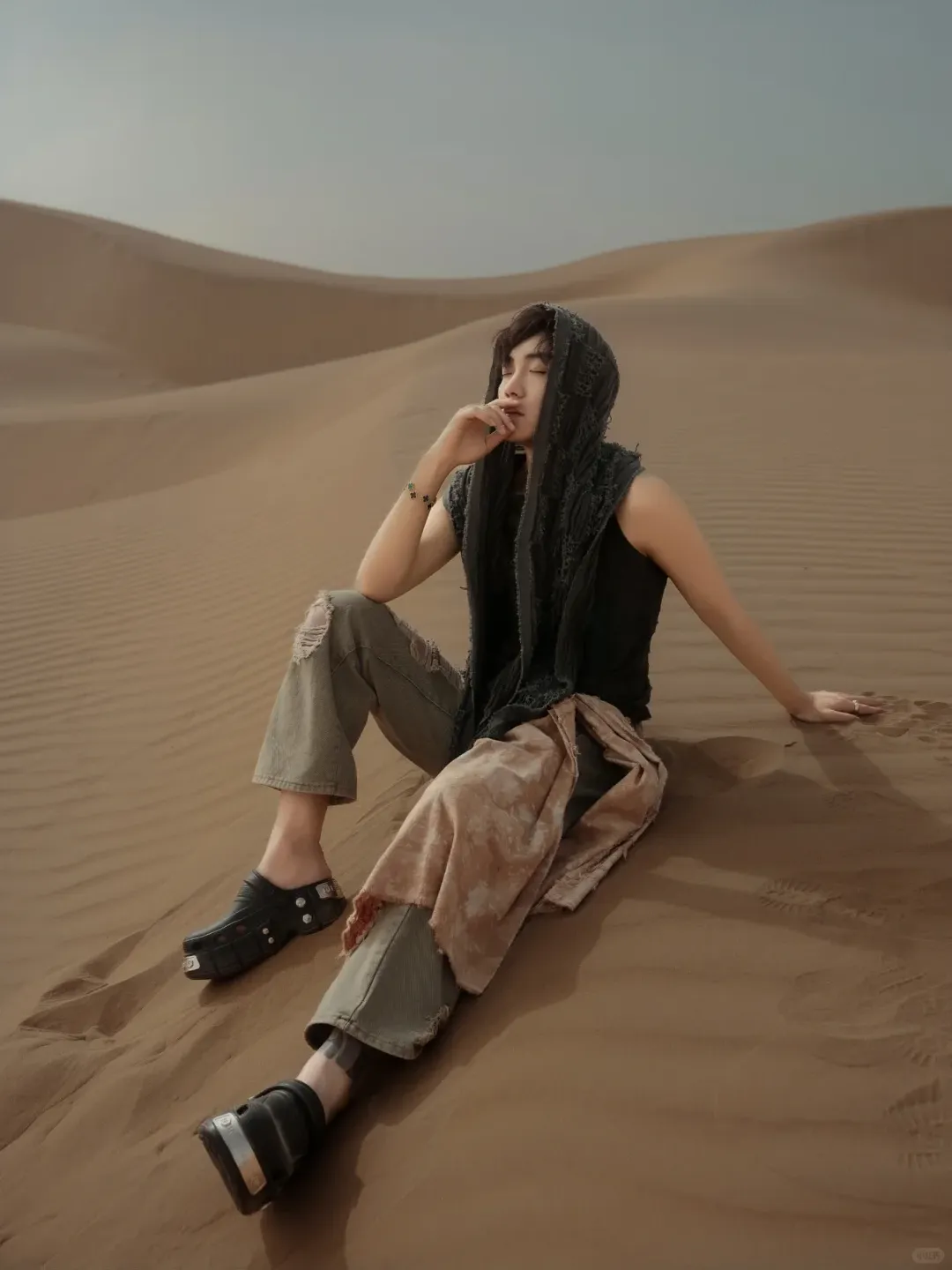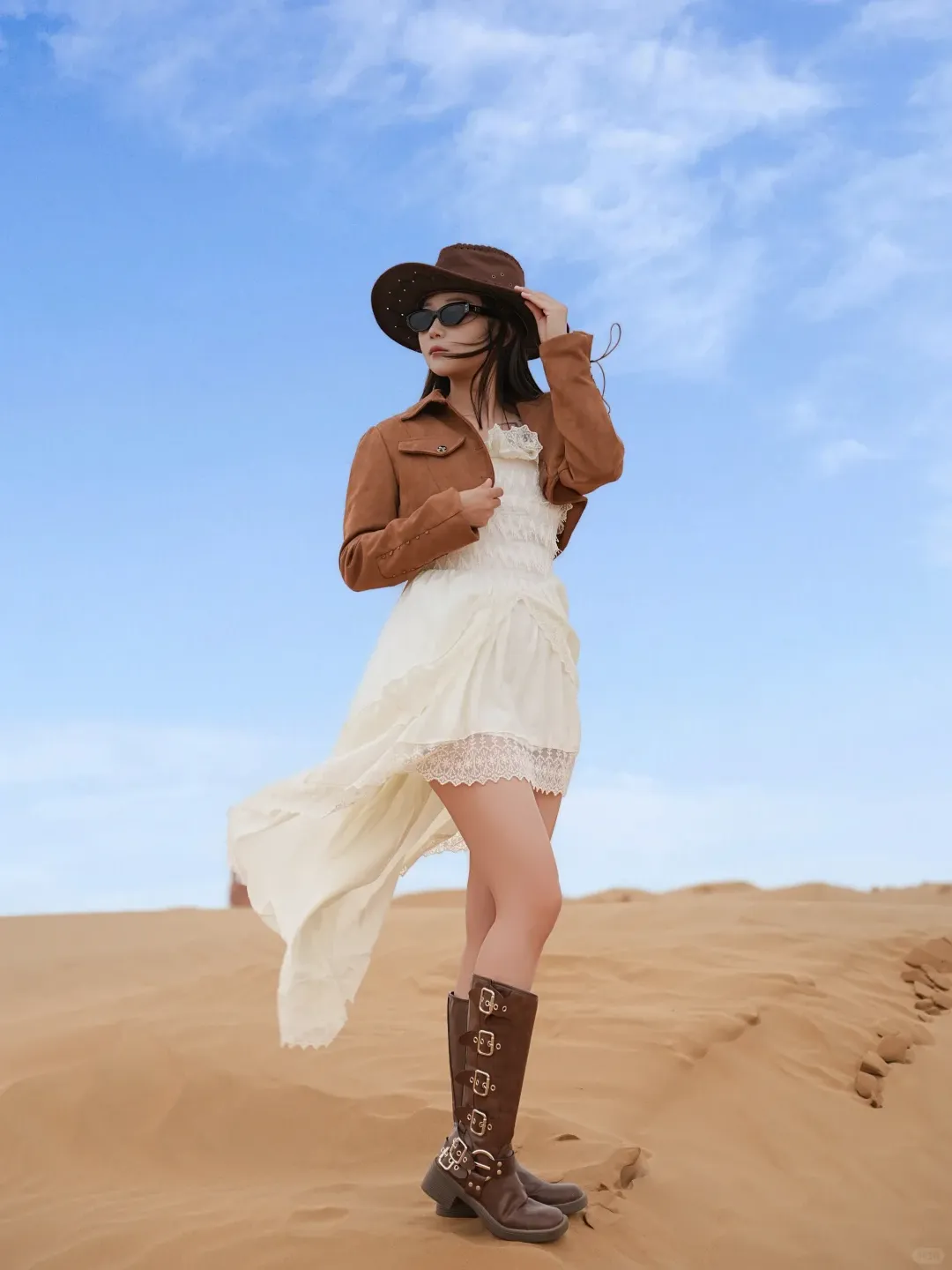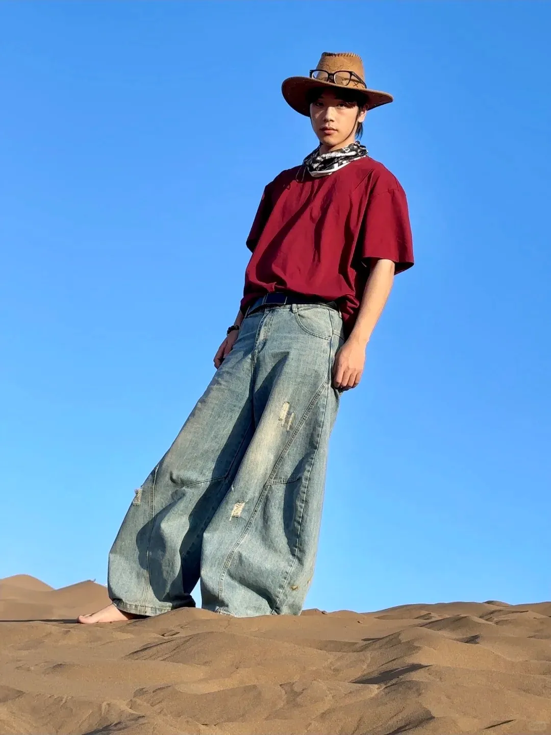 正红、铁锈红、赭石、南瓜橘,这是沙漠穿搭最经典也最出片的颜色。万顷黄沙里一点红,就是最原始的生命力