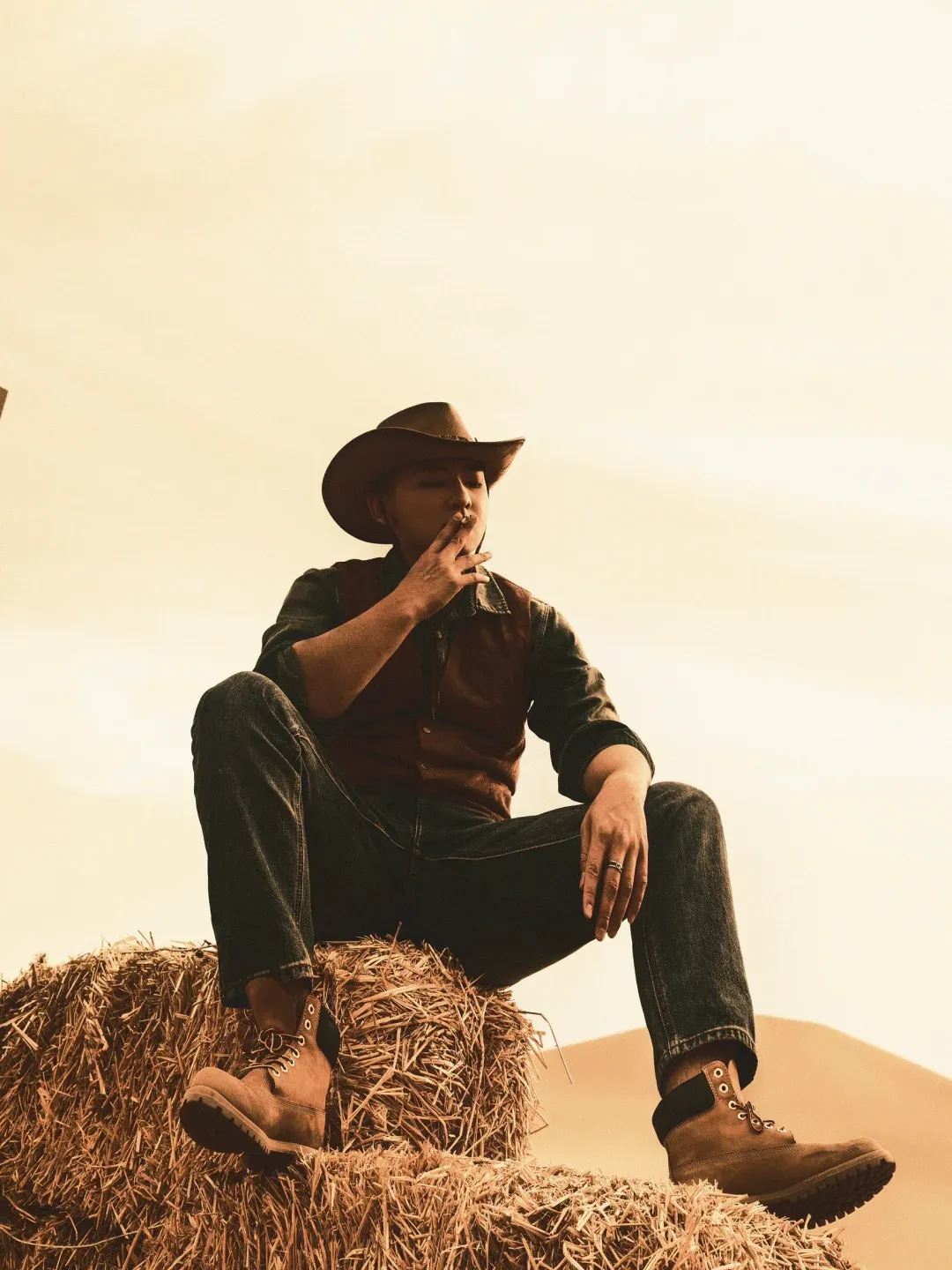 和女士版的飘逸画意不同,男士在沙漠里的穿搭内核是纯色、廓形、功能性,像“荒野旅人”