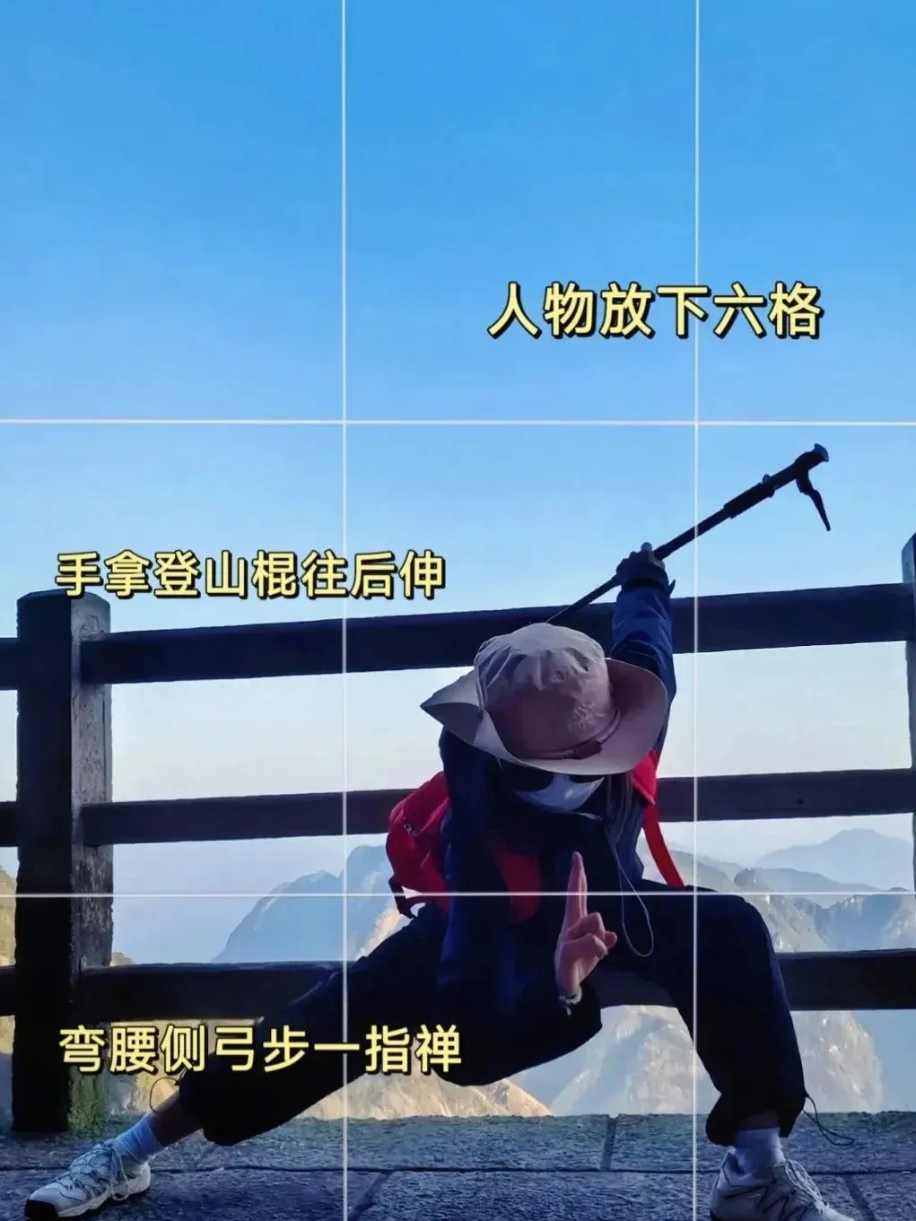 ⭐人物放下六格,手拿登山棍往后伸