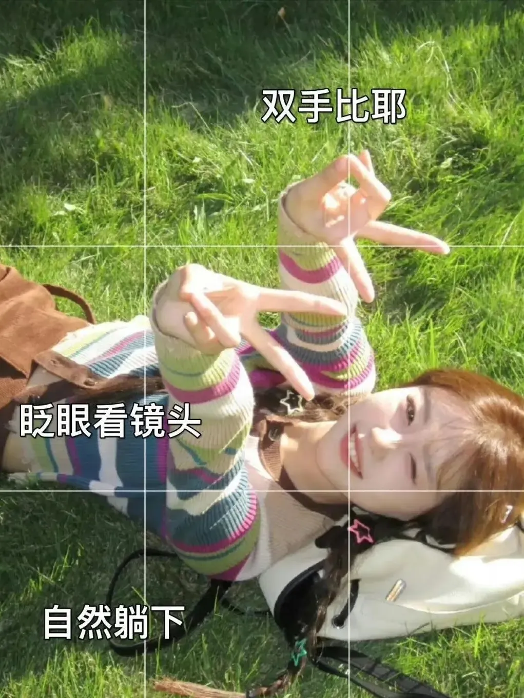 ⭐双手比耶,眨眼看镜头,自然躺下