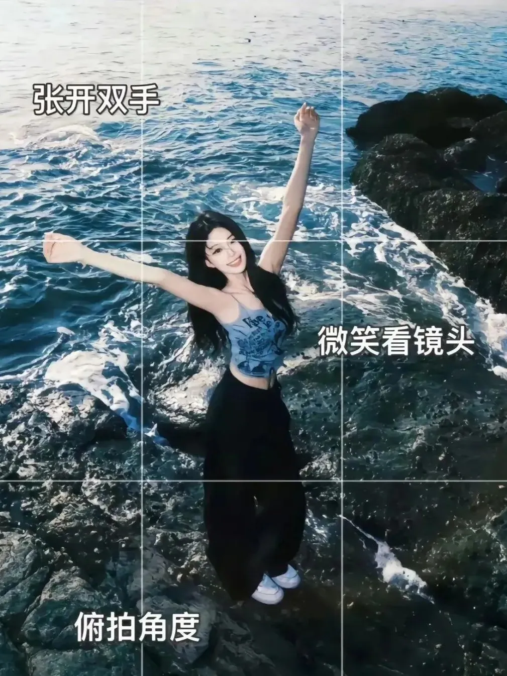 ⭐张开双手,微笑看镜头,俯拍角度