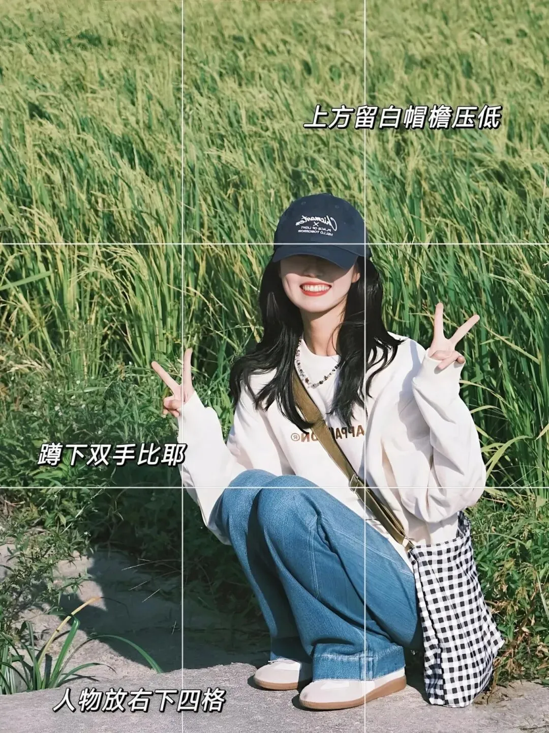 ⭐上方留白帽檐压低,蹲下双手比耶