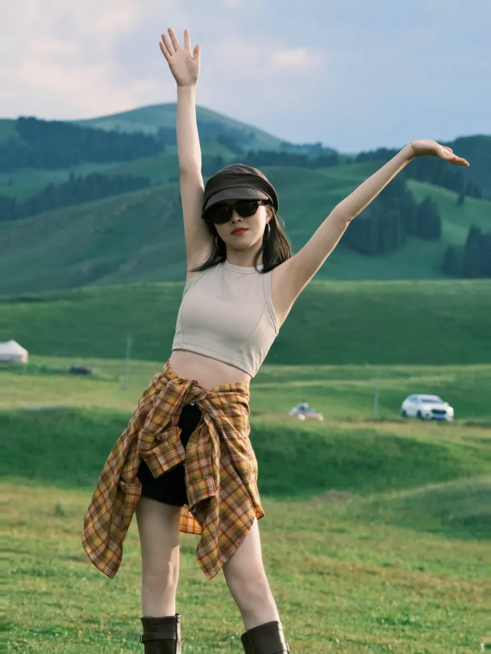 针织背心/纯棉T+阔腿裤/工装裙+同色系帆布鞋,背景是红橙黄的山,绝对堪比写真大片
