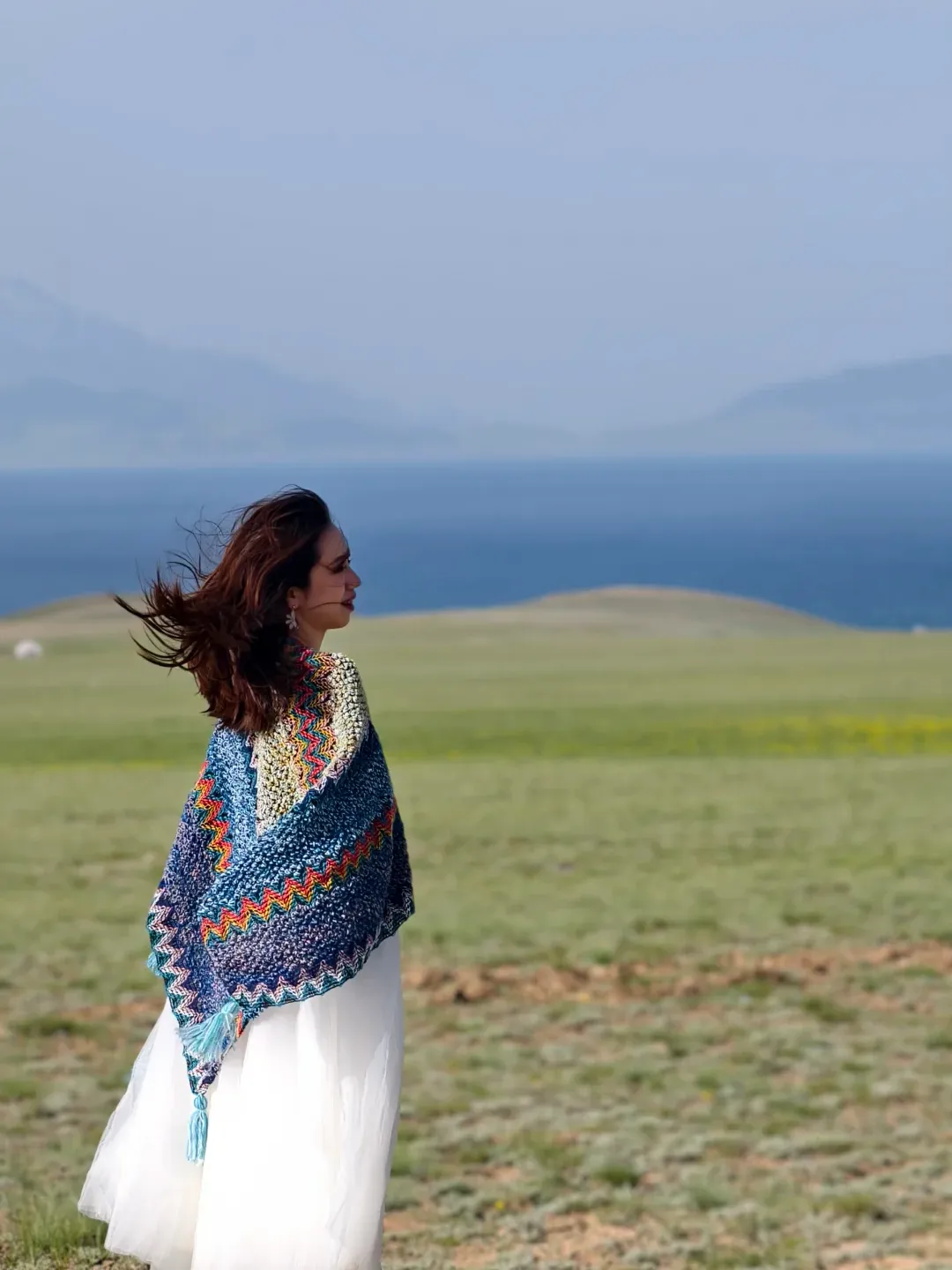 而且披肩也不一定非得披在肩上,需要时可以系在腰间作腰裙,或者迎风扬起来制造飘逸感