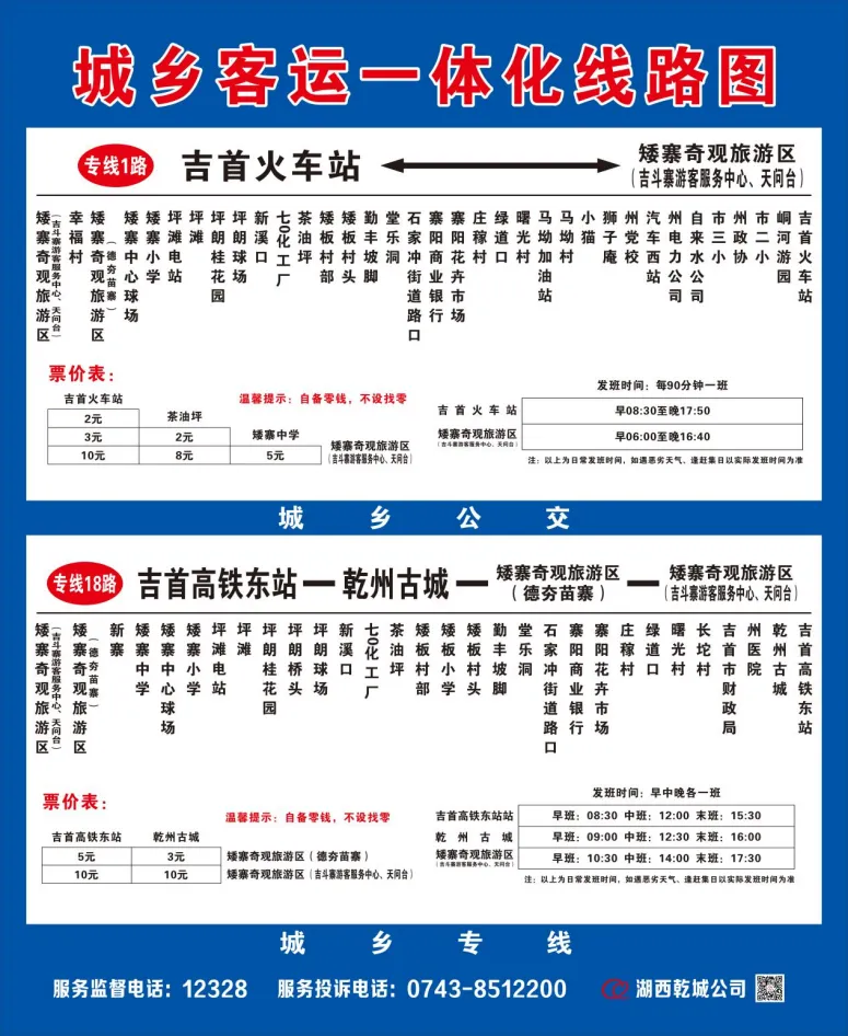 ②从吉首高铁站出发,乘坐专线18路旅游专线(大约1.5小时),途中可前往【德夯苗寨】以及终点站【吉斗苗寨景区游客服务中心】,票价分别为5元、10元。