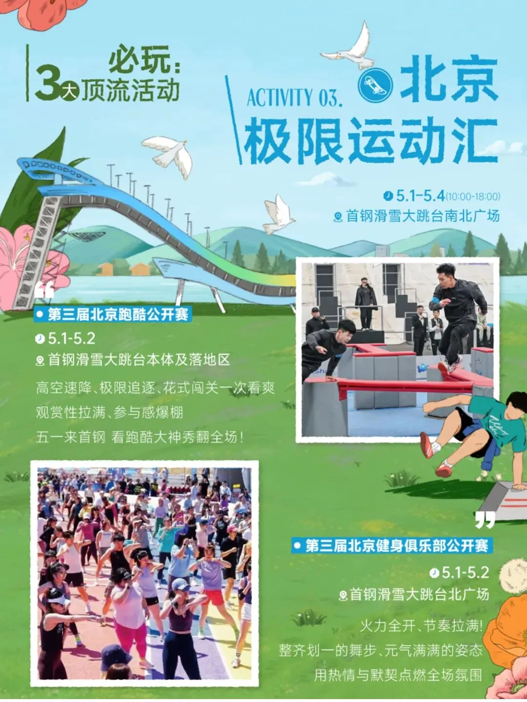 亮点:这里有跑酷、体能赛、健身瑜伽等潮流运动,非常适合热爱运动和街头文化的你。