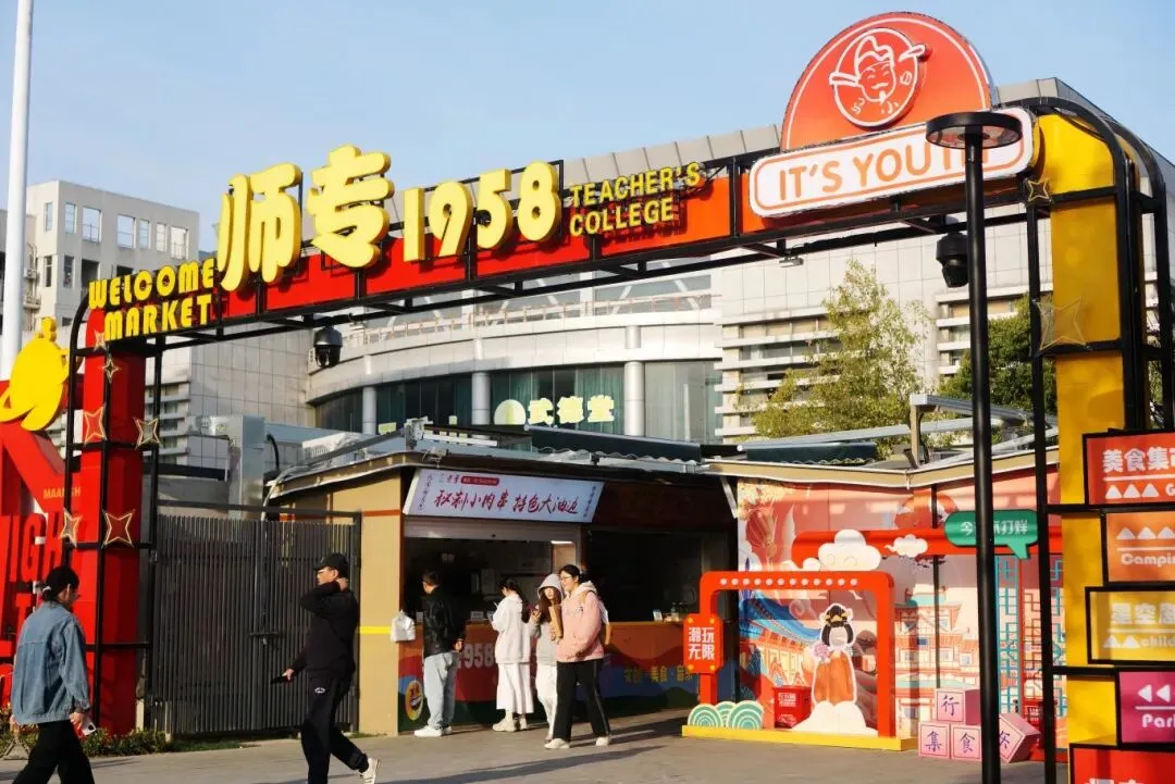 随后搭乘909路公交车,直达新晋网红打卡地师专1958美食广场。青春感满满的网红美食地标!3600㎡街区、150+摊位,复古风店招+暖光灯带超有氛围。必吃大叔烤肉串、超大里脊饼、炸蘑菇,还有星空剧场露天电影、乐队演出、网红打卡亭,吃完美食拍大片,沉浸式感受校园烟火气。