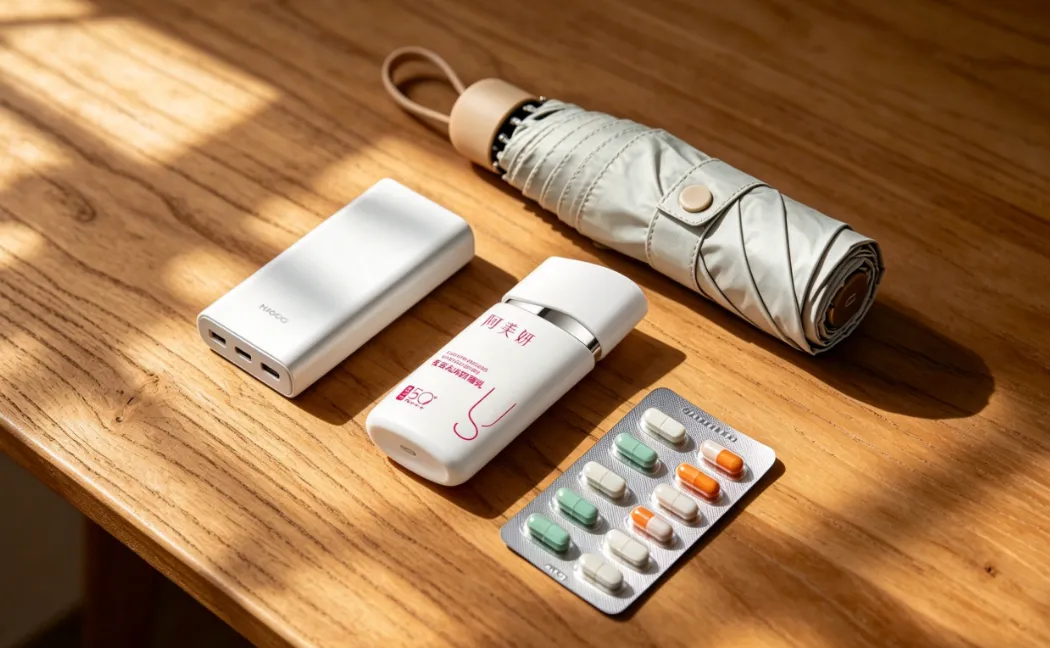 防晒产品:提前30分钟涂抹防晒霜(SPF50+、PA+++以上),面部、颈部、手臂、脚踝等暴露部位都要涂,每隔2小时补涂一次(出汗、玩水后及时补涂);带一支防晒喷雾,方便补涂,避免漏涂死角。 物理防晒:搭配防晒帽(宽檐款,遮挡面部和颈部)、防晒衣(冰丝款,透气不闷热)、太阳镜,既能防晒,又能凹造型,拍照超出片。 避开暴晒时段:每天10:00-16:00是紫外线最强的时间,尽量减少户外活动,如需出行,选择阴凉路段,避免长时间直射。