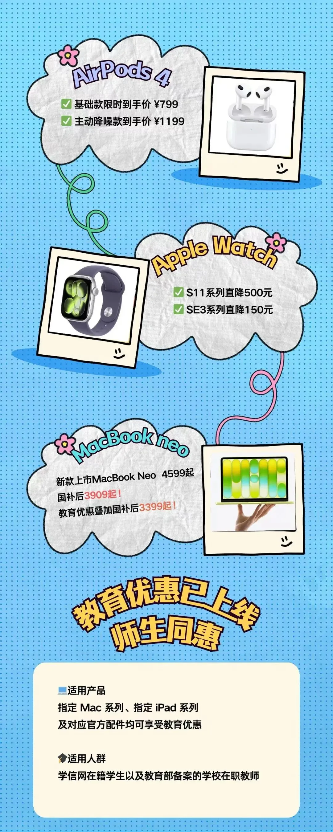 AirPods 4低至799元、Apple Watch最高减500元,MacBook Neo国补后3399元起,师生还能叠加教育优惠!