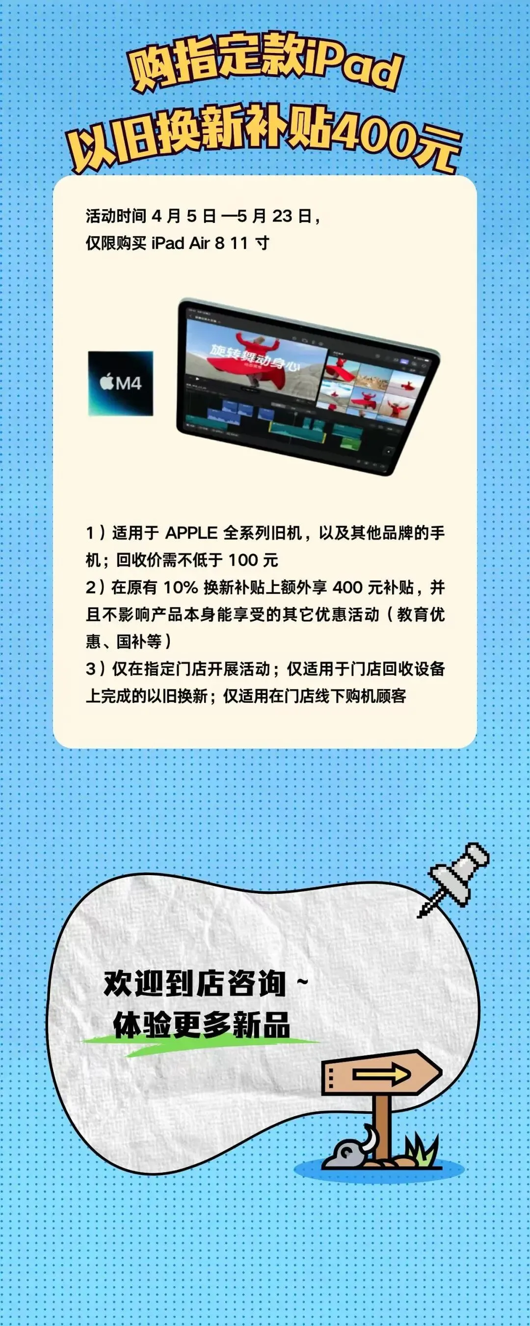 购iPad Air 8 11寸,以旧换新额外再补400元,优惠不冲突!