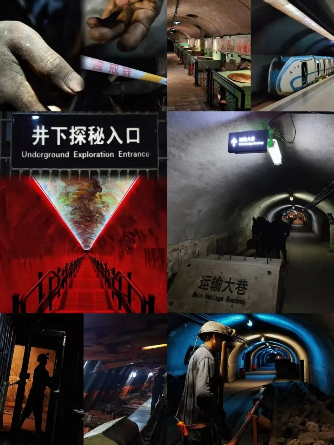 井下探幽即下矿洞,百余米深,穿过蜿蜒曲折的隧道,空气中弥漫着潮湿和尘土味,实景展示了从最原始的人工挖煤一直到现代最先进的采煤技术。踏入幽深巷道,凉意+厚重感扑面而来斑驳岩壁、老旧轨道、真实采煤设备安静到只剩脚步声。