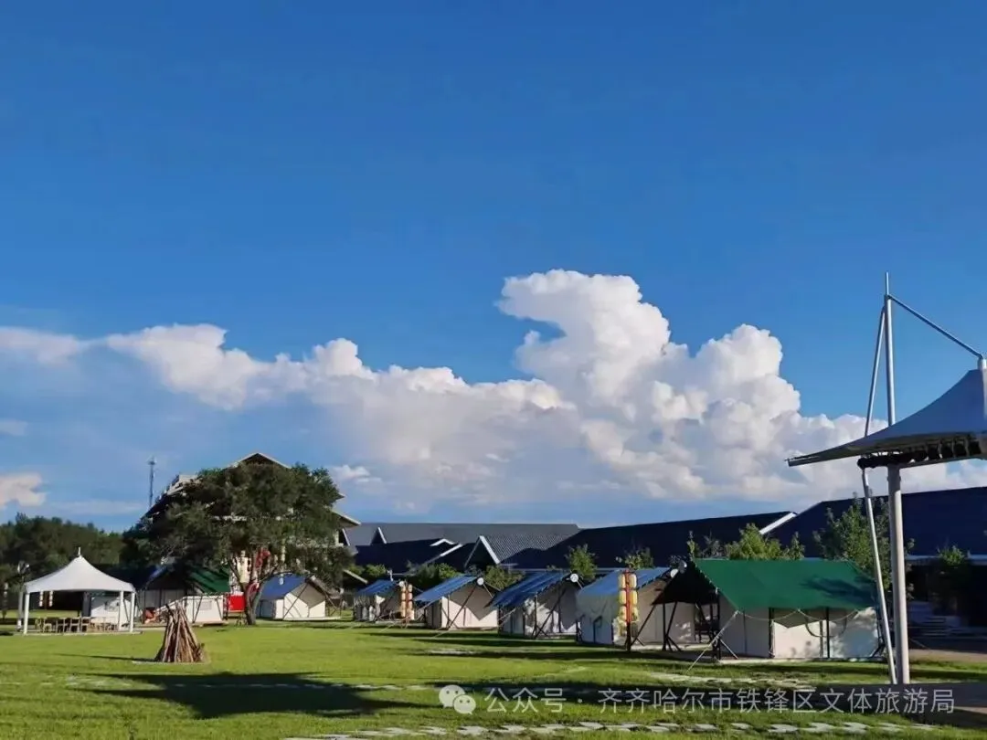 卜奎云鹤露营地位于铁锋区扎龙镇哈拉乌苏村,营地内设轻奢帐篷区、烧烤区、无动力乐园、露天影院、喷泉水系等,可一站式体验露营住宿、BBQ 烧烤等特色美食,夜晚有篝火晚会、烟花秀,氛围感拉满。