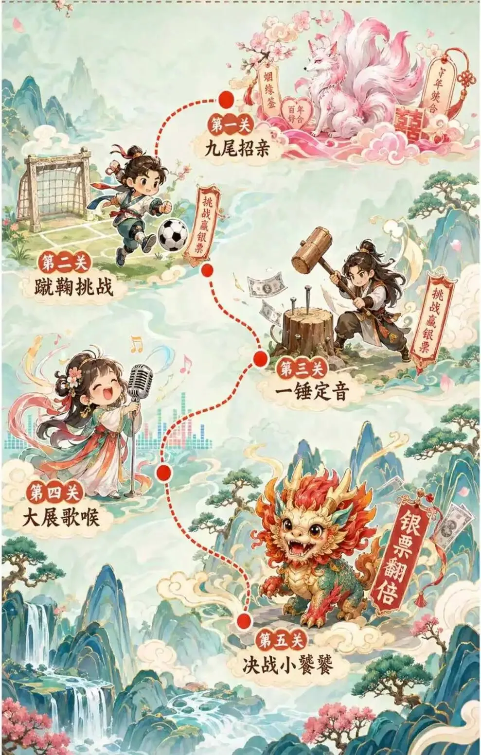 游戏规则:游客答对 1 题 / 完成诗词接龙,即可领取 “宠客登山能量包” 1 份,同时获赠 1 万两初始银票。