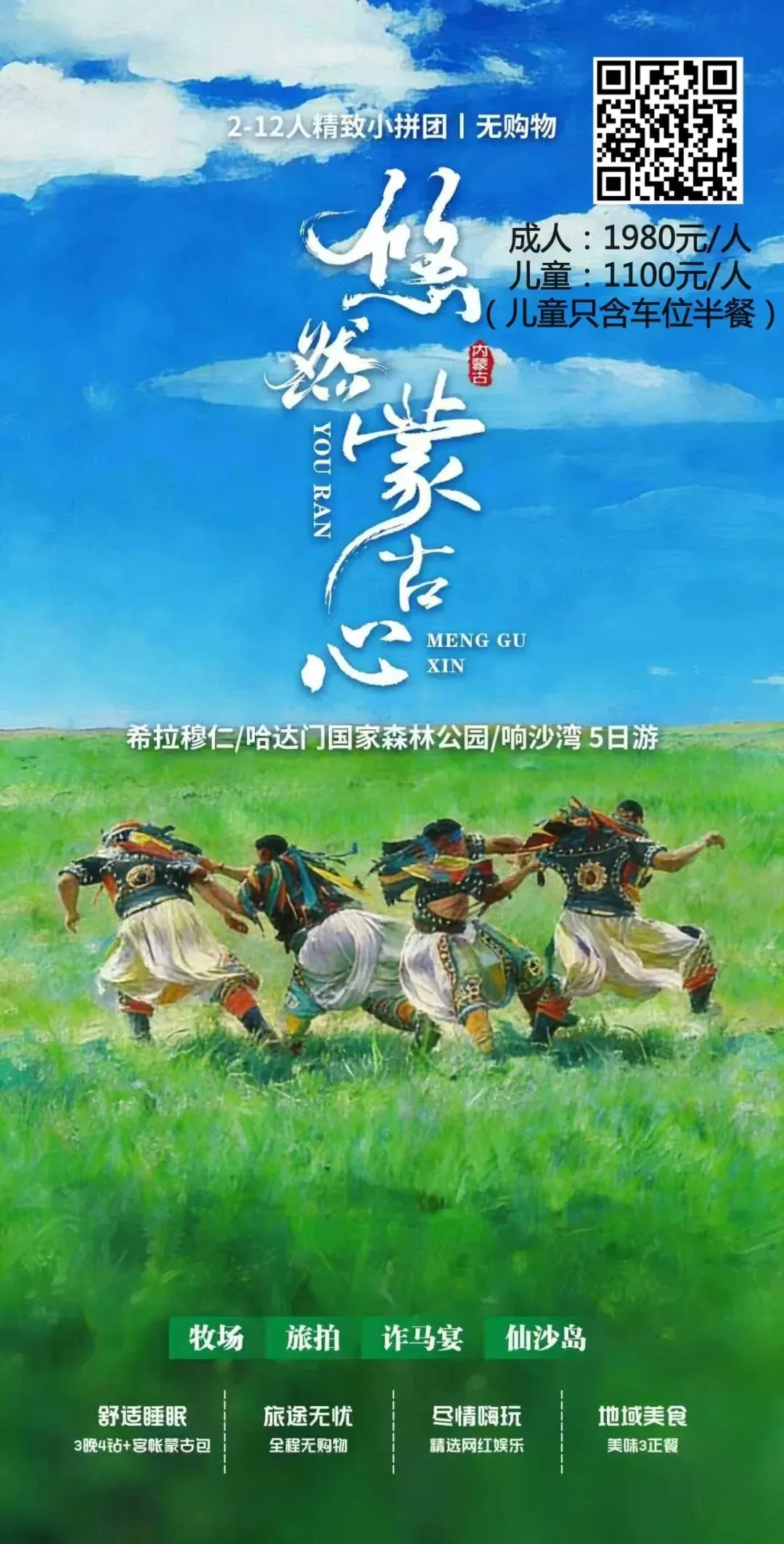 一次好的旅行,取决于一个正确的决定!如果您计划来内蒙古首府呼和浩特来玩的话,参加蒙之情国旅纯玩团,价格合理又避坑,选择正规的旅行社,资质可查,报名即可签订正式旅游合同,全程监督跟踪,30年内蒙古当地旅游经验,线路设计合理,不进任何形式的购物店,无车推,不赶路睡到自然醒,真正意义的纯玩,来呼和浩特这样玩,真的省钱省心不好吗?每张图都是一条线路,看好哪条的话,告诉我们,根据您的要求人数、要求,设计您的专属旅程!