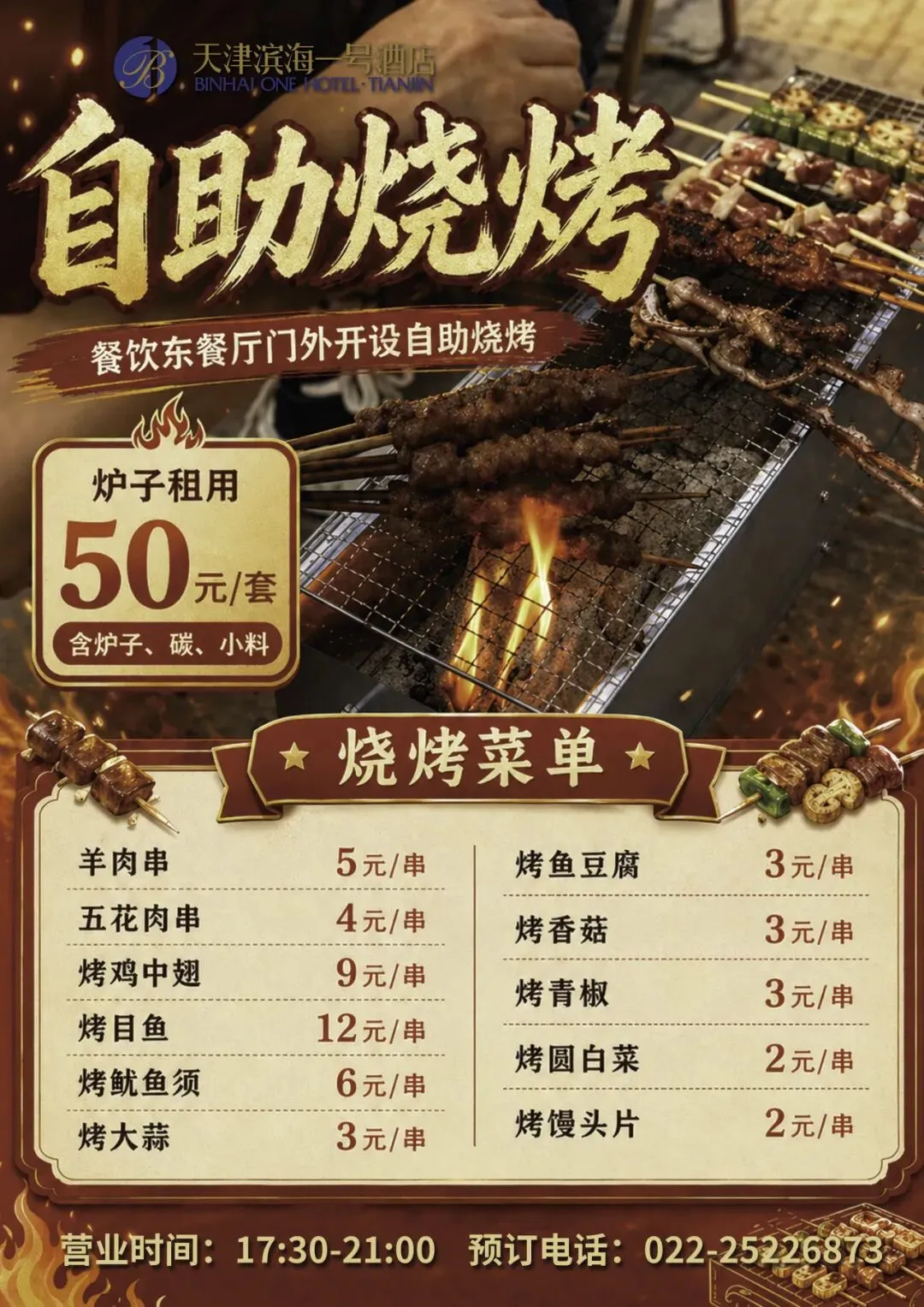 夜幕降临,自助烧烤暖心开席,烟火滋滋飘香,各式烤串风味十足,解锁夜晚舌尖狂欢