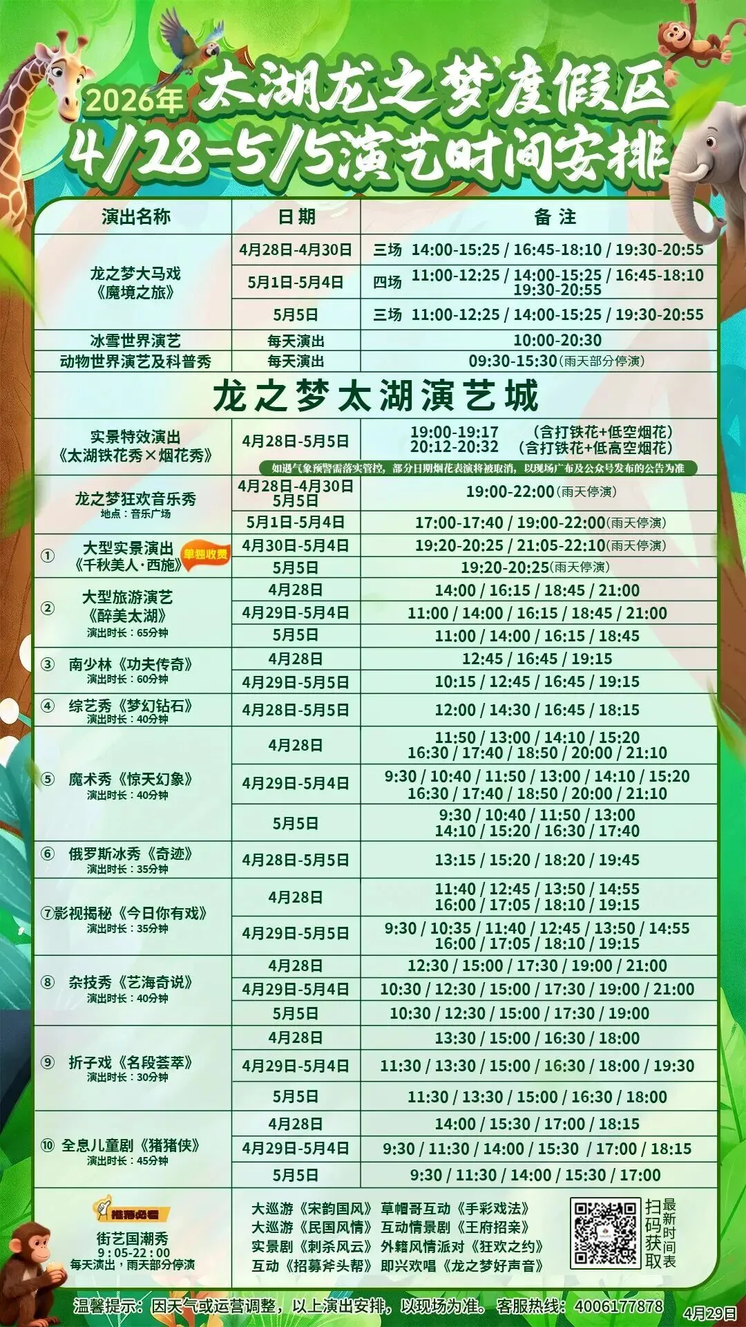 13:30 ~ 21:30 游玩太湖龙之梦度假区太湖演艺城。江浙沪亲子度假天花板,对标长隆的!这里汇聚星级酒店群、大马戏、动物世界、海洋世界、嬉水乐园、湿地公园等多元业态,还有高空烟花、烟火水舞秀轮番上演,一站式吃喝玩乐全覆盖。