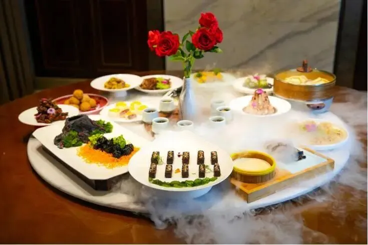 餐饮服务:融合南北菜系精华。酒店餐饮中心设有34间风格各异的宴会包房,可分别容纳8人、10人、12人,以及20至30人的VIP包房。此外:自助餐厅环境幽静雅致,提供精致早餐与营养午餐,最多可容纳150人同时就餐;咖啡厅设计高贵典雅,供应咖啡、茗茶及甜点;多功能宴会厅装饰炫丽奢华,可同时为七场婚庆喜宴提供室内外婚礼场地及套餐服务;餐饮中心总容量可达1000人同时用餐。菜品以鲁菜为主,融合孔府菜、川菜、粤菜等菜系精华,并巧妙融入平阴本地特产(如玫瑰和阿胶),精心烹制出色、香、味俱佳的专属菜肴。