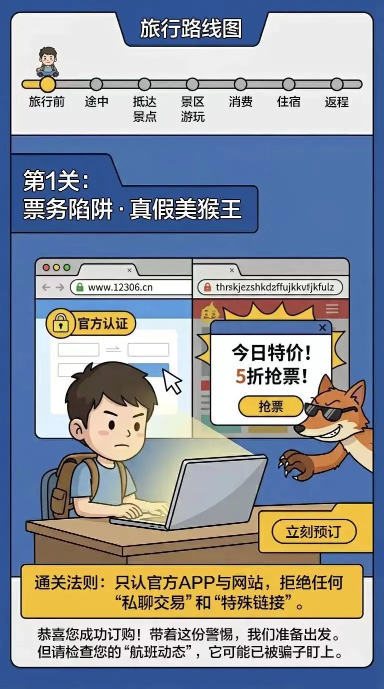 五一假期将至,许多人已经安奈不住出游的喜悦,然而 当您沉浸在规划行程时,一双双“黑手”也伺机而动,布下了重重陷阱,这份旅游指南希望能为您点亮一盏警示灯,助您慧眼识破套路,守护好钱袋子与好心情,真正的享受一个安心的假期。 启程---行前准备篇