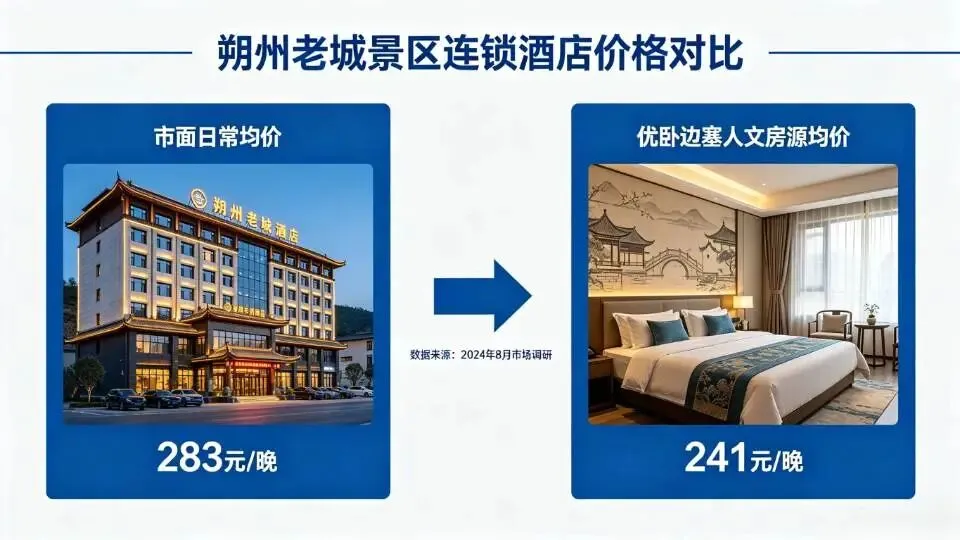 朔州老城、景区、高铁站连锁酒店,市面日常均价283元/晚。喜欢晋北小众深度游的游客,都会本地比价控预算,优卧边塞人文房源均价仅241元/晚,长线连住、人文研学省钱优势明显。