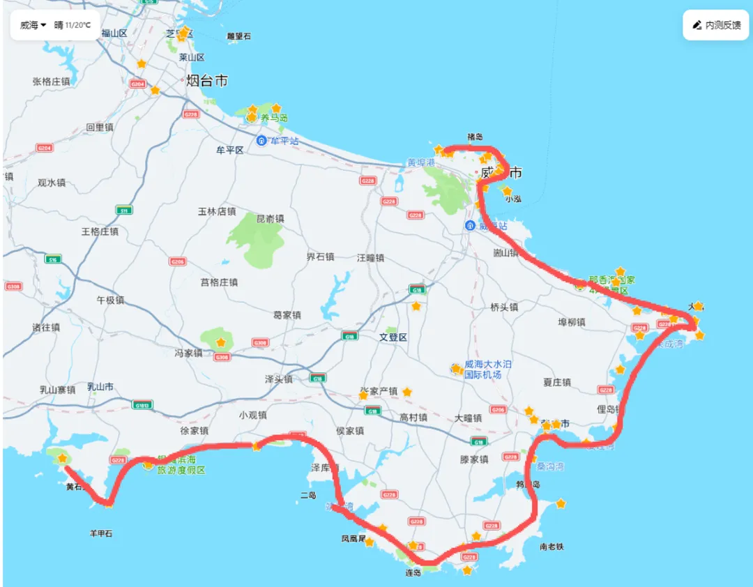 威海,整个游玩路线基本都是沿着海滨一线的。自驾游也基本沿着海岸线走。