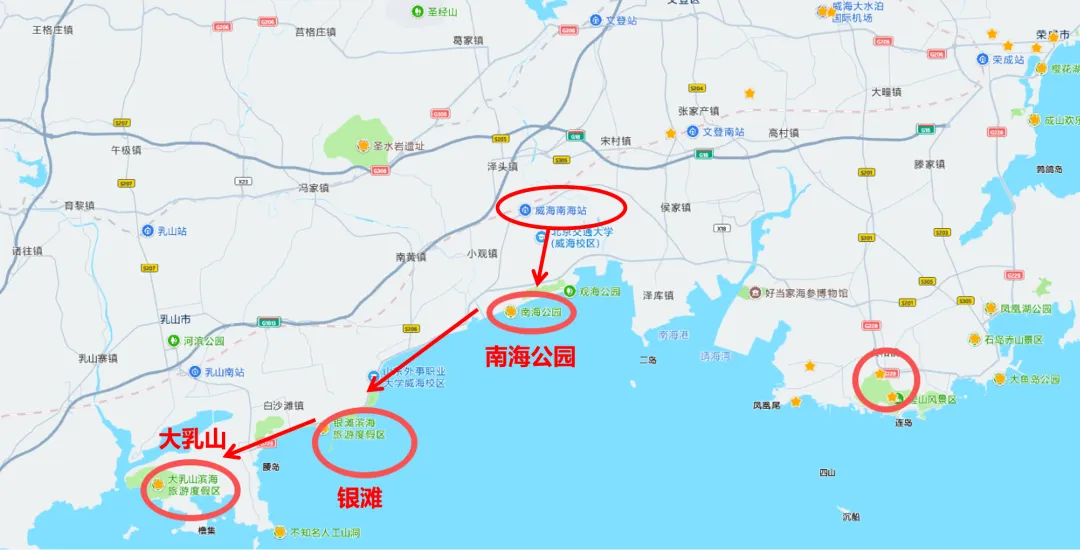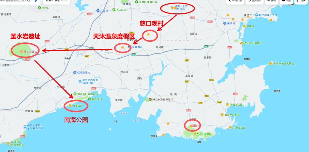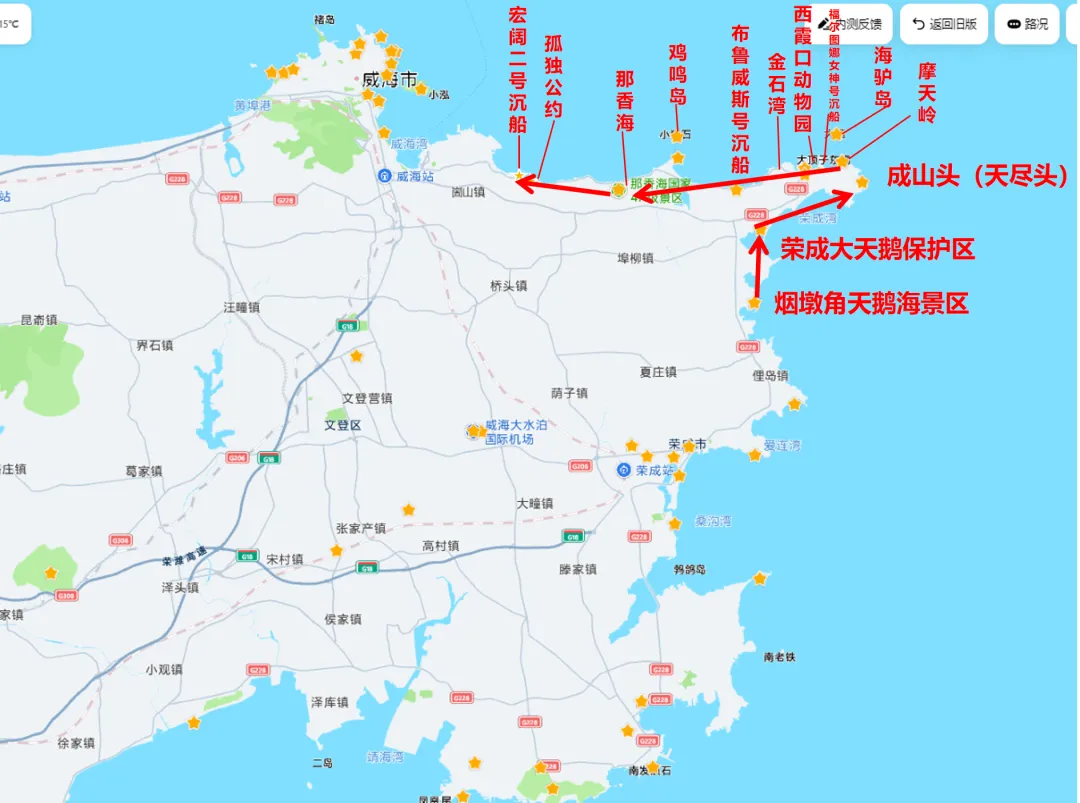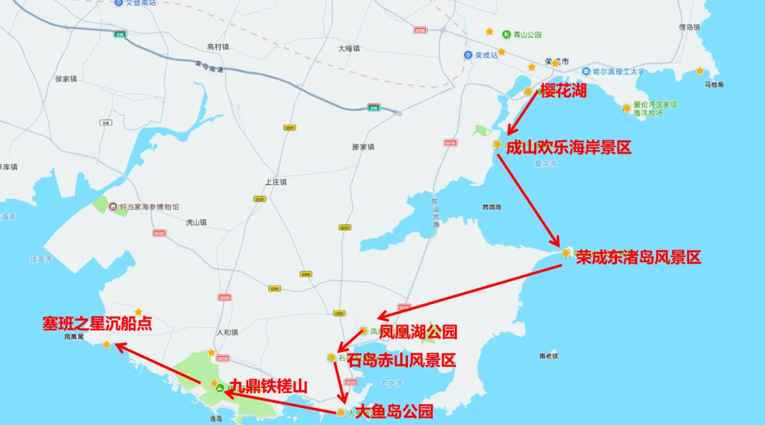 3、荣成北部游玩路线(这条路线大概1-2天,取决于是否要去鸡鸣岛,路线正反都可以)