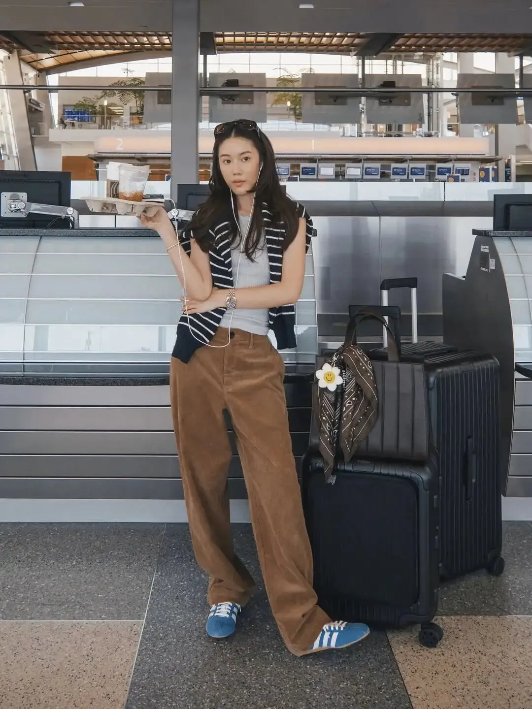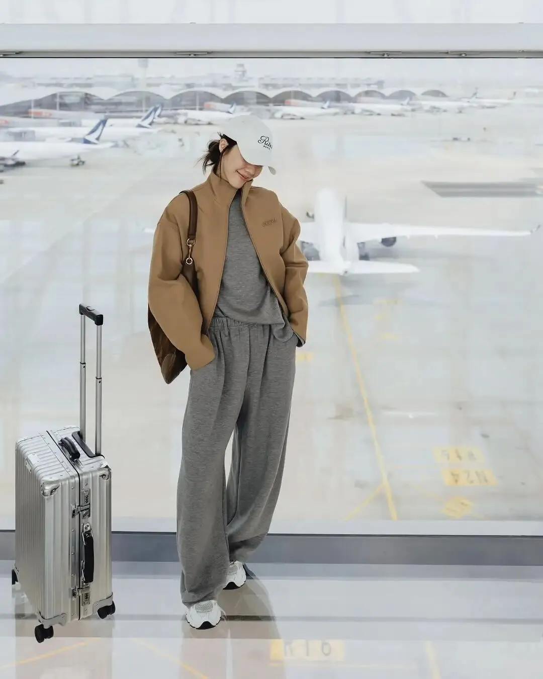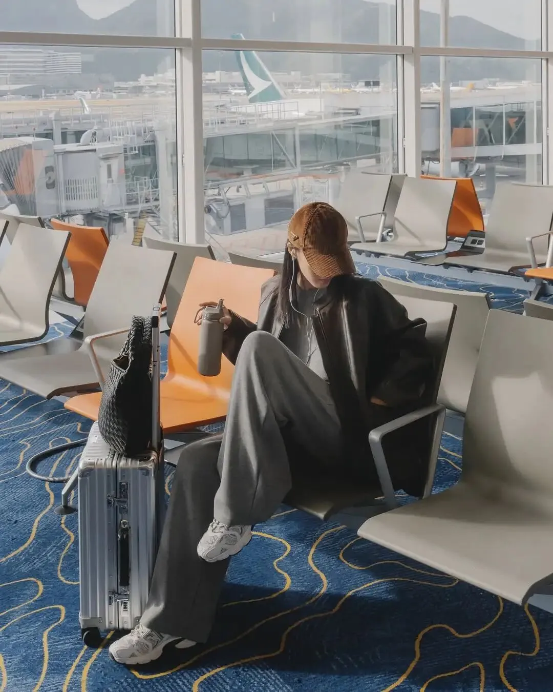 不论是在候机厅吃快餐、等摆渡车、行李转盘旁边等行李,这些都是旅行中的一部分,换上休闲装,用鸭舌帽和墨镜就能轻松出片。