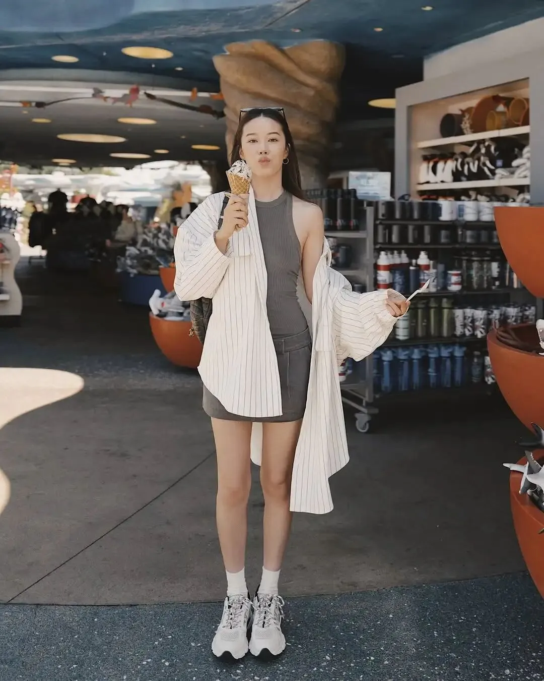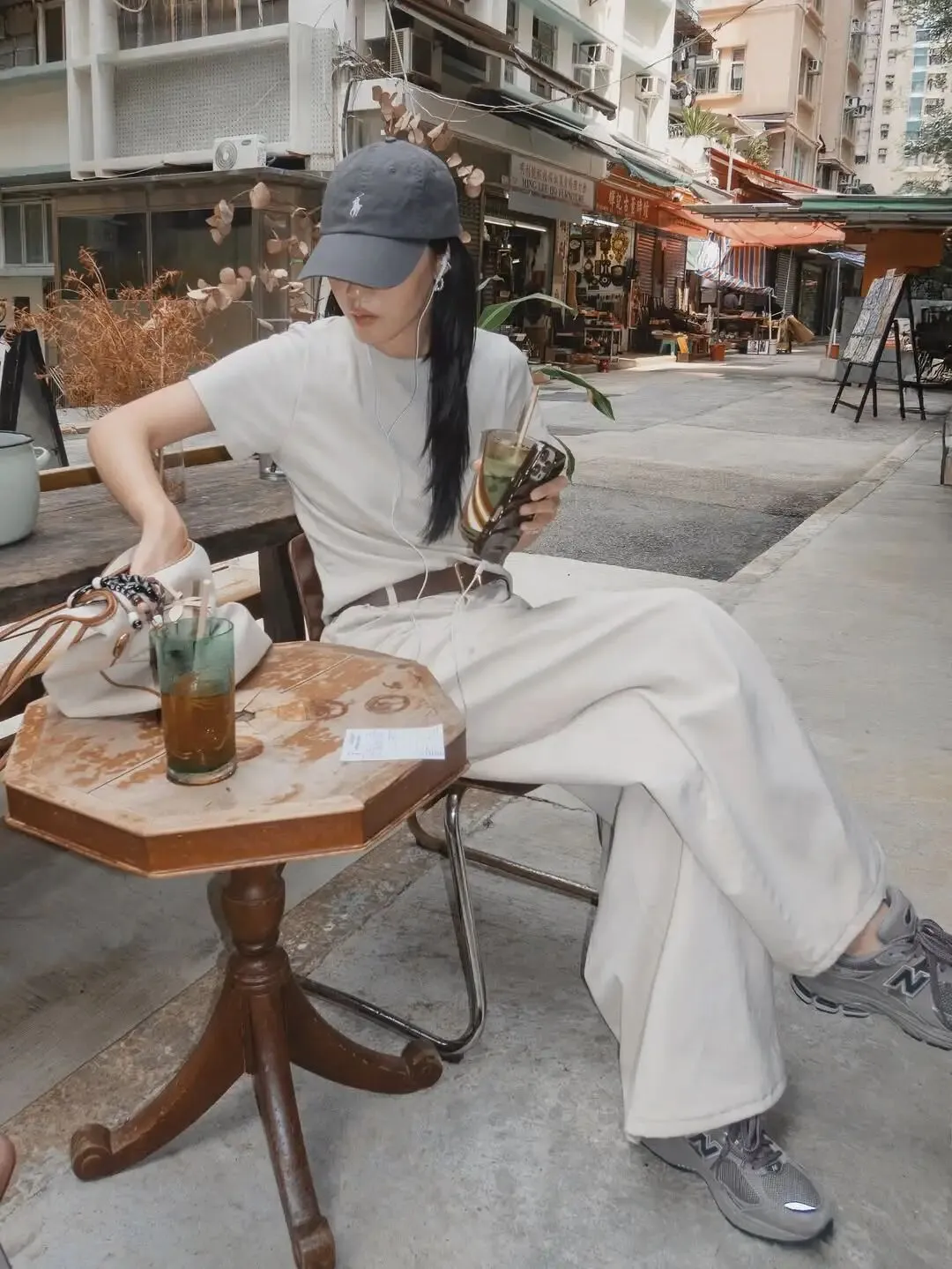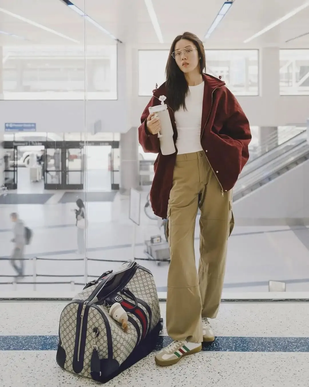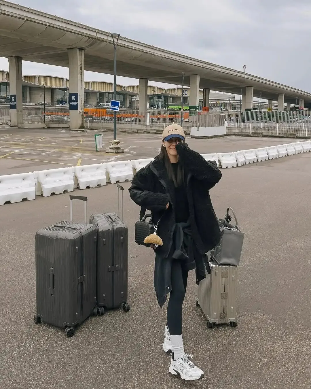 不论是在候机厅吃快餐、等摆渡车、行李转盘旁边等行李,这些都是旅行中的一部分,换上休闲装,用鸭舌帽和墨镜就能轻松出片。