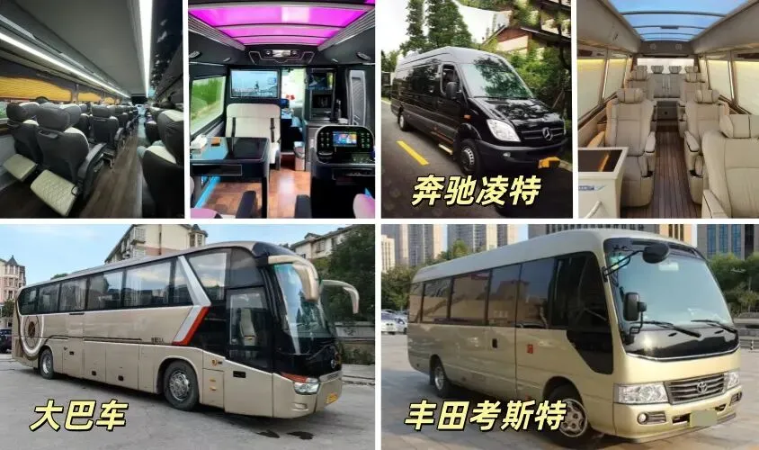 14-19座奔驰凌特、丰田考斯特19-23座,33座宇通大巴,45-53座宇通大巴—适合企业团建、会议接送、旅游团体。