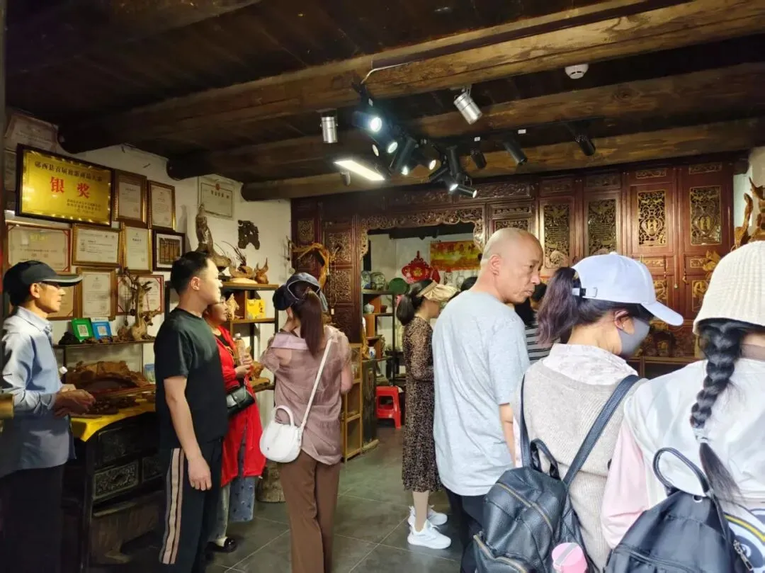 七夕文化沉浸式街区 古色古香、灯影摇曳,沿街有根雕室、织布坊、文创店、特色小吃铺,可体验乞巧花馍、郧西织布、罗氏根雕、非遗糖画,夜晚华灯初上,文艺表演精彩纷呈,氛围感拉满。