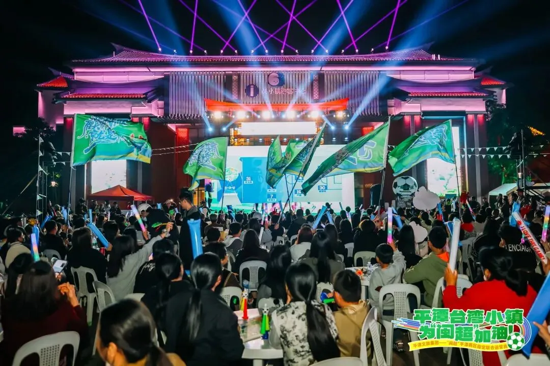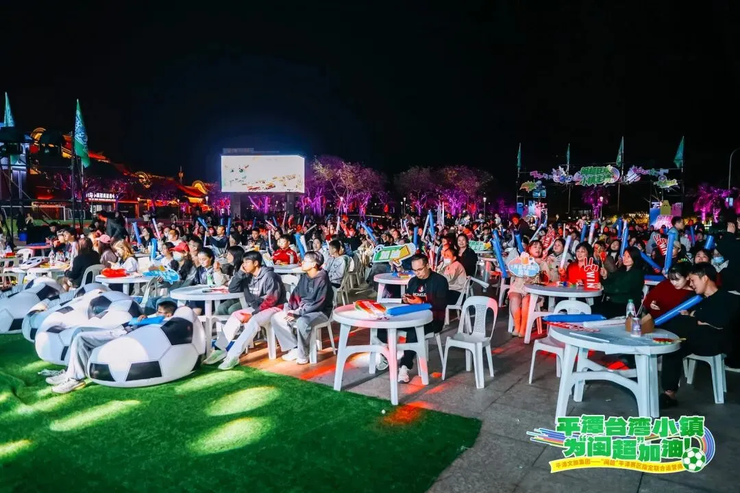 夜幕渐临,平潭台湾小镇第二观赛现场氛围感拉满!广场上,大家围坐屏前,一同为球员呐喊助威、畅享赛事狂欢。
