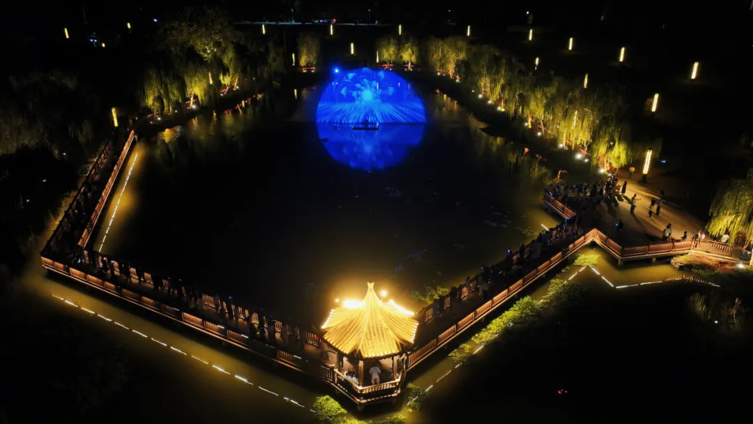 夜色落在月亮湖上,水面与灯光交织成诗。沿着柳树灯光诗词小道走过去,便能看到水幕电影缓缓展开。它不只是一个演出装置,更像是东流讲述自己的一种方式:用水,用光,用夜晚,把故事投射出来。