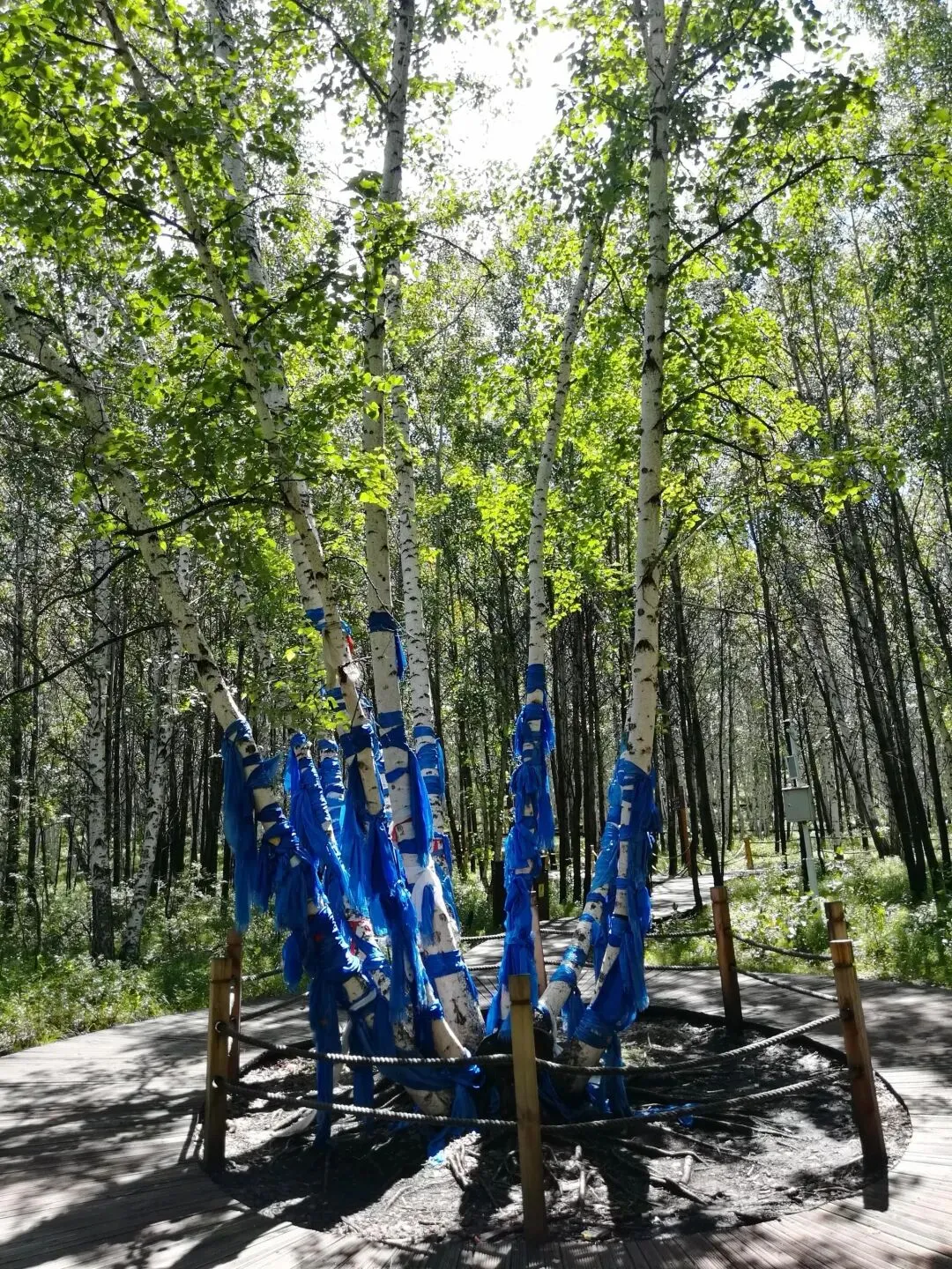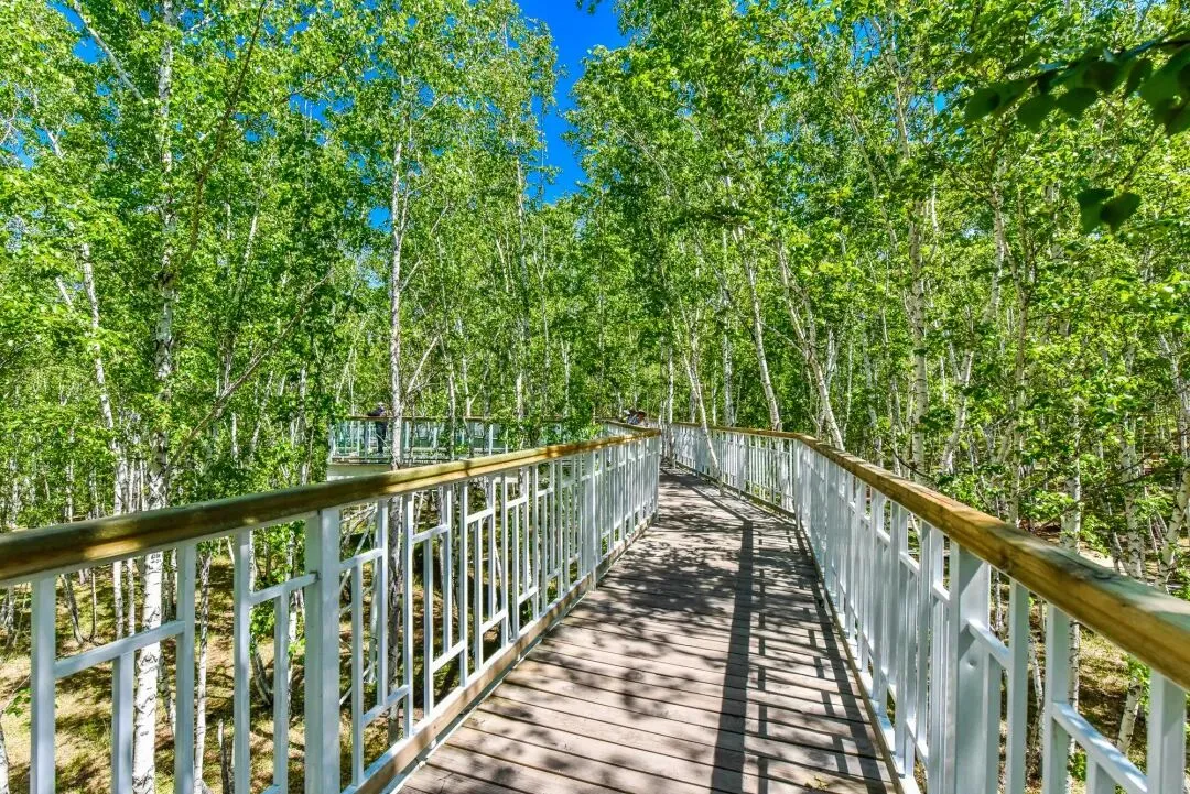 空中栈道:中国唯一建在白桦树梢的栈道,全长300米,玻璃平台可俯瞰林海。