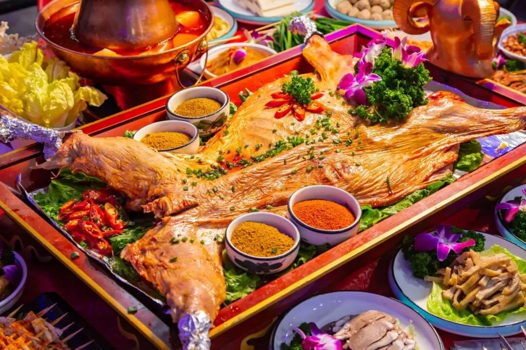 2、烤全羊:整羊腌制后慢火烘烤3-4小时,外皮金黄酥脆,内里肉汁饱满。上桌时系红绸,行开羊仪式,搭配荷叶饼、黄瓜解腻。