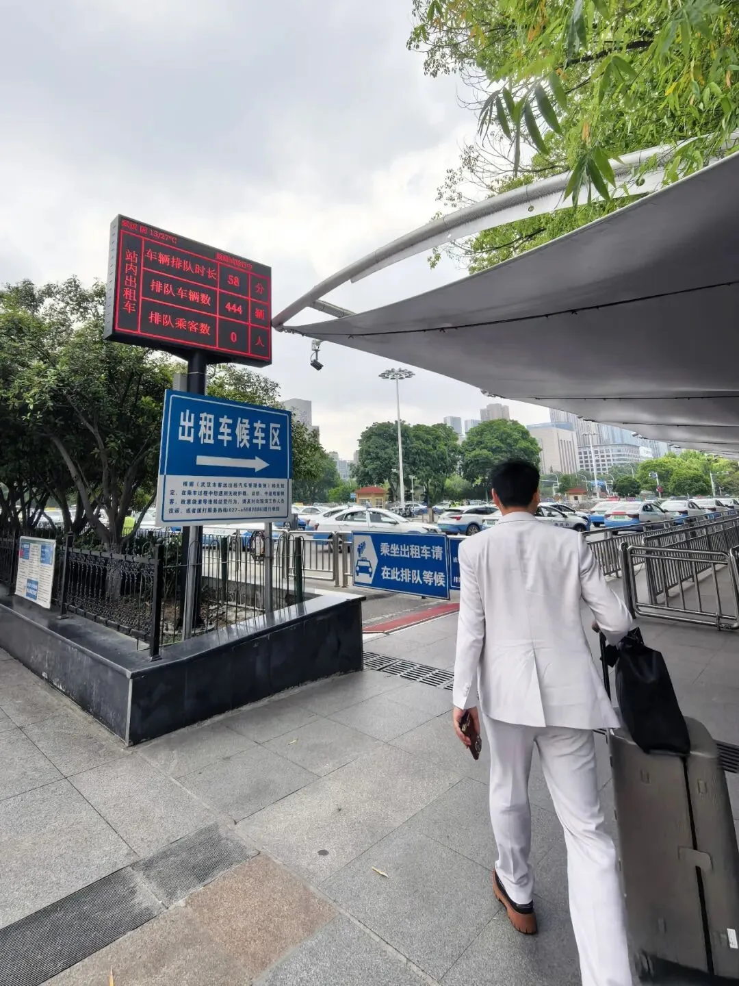 在出租车候车区入口处与汉口站旁银墩路,均装有电子显示屏,当天天气,候车区人车流量、排队时长一目了然,方便高峰期旅客与司机快速选择出行/载客方式。