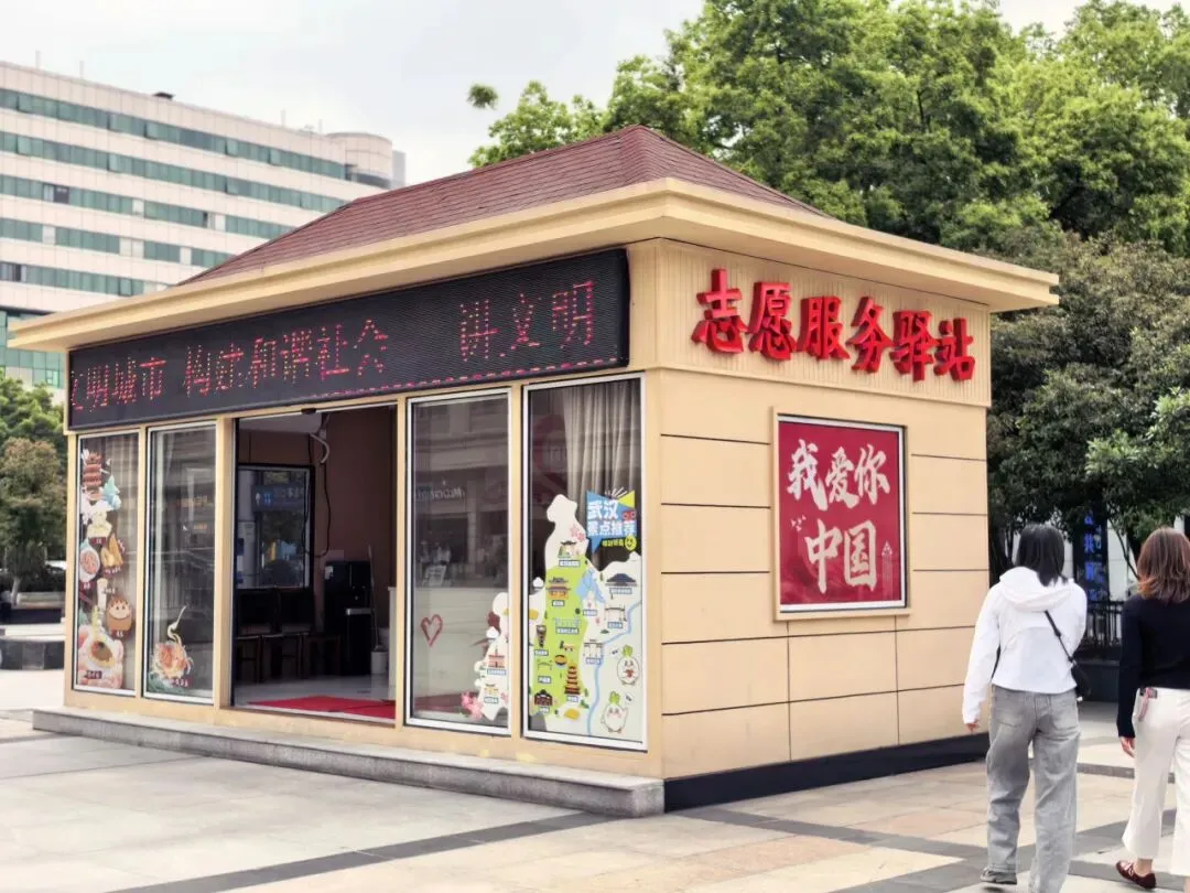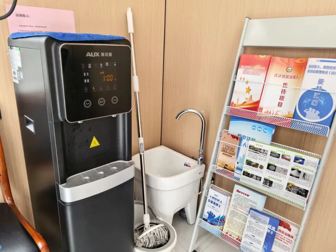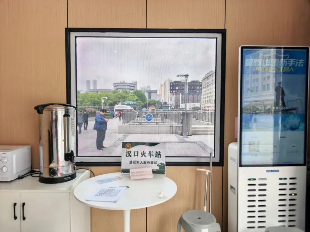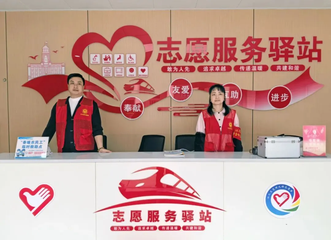 在站前广场显眼处的志愿服务驿站,两名志愿者日常负责为群众答疑解惑,驿站内提供饮水、应急药品、爱心轮椅、饭菜加热等服务,同时这里也是农民工兄弟临时救助点和退役军人服务驿站。