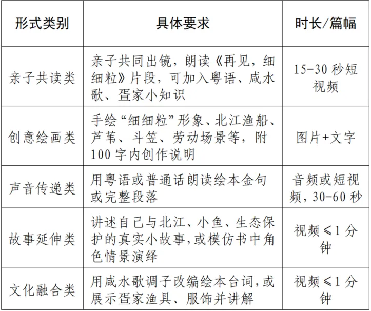 😍玩法:摘抄《再见,细细粒》暖心金句,或围绕绘本、北江生态、疍家文化、劳动节,原创阅读短句、劳动寄语。