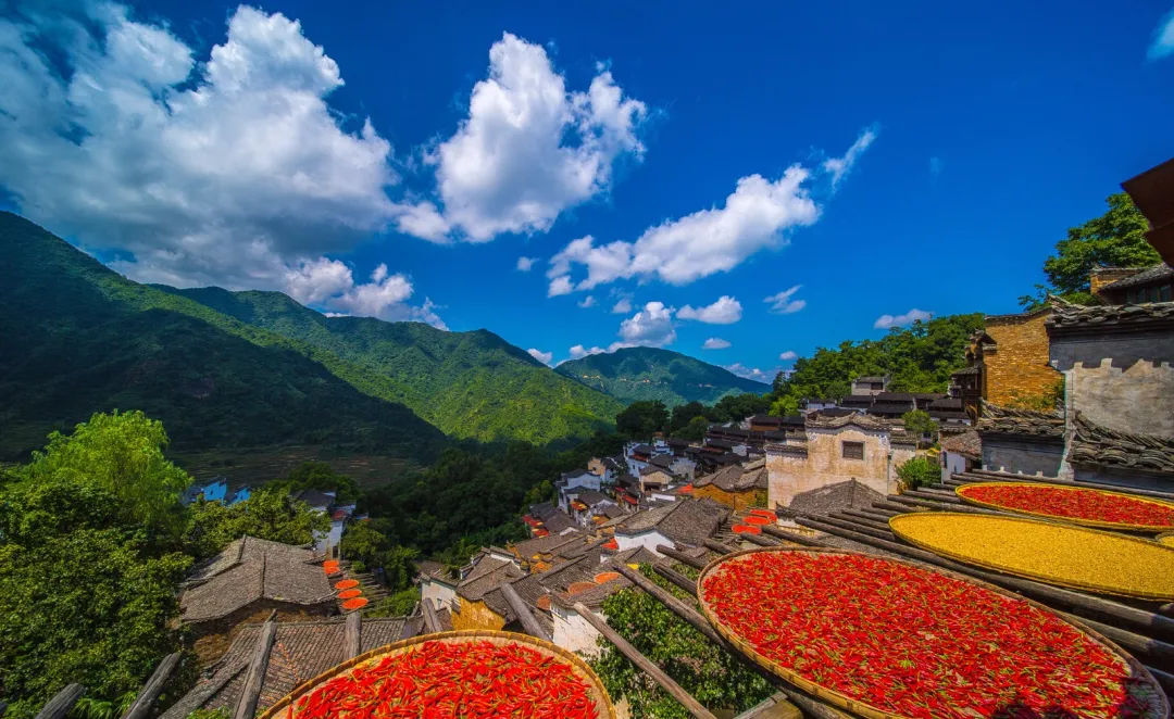 篁岭这个村子特别值得专门去一趟,这是个建在山坡上的村子,家家户户门前都有晒台,秋天一到,家家户户把辣椒、玉米、稻谷拿出来晒,红的黄的橙的,一层层叠上去,配上徽派建筑的黑白灰,这个色彩对比真的很绝,而且这不是摆拍,是人家真的在晒粮食,你能看到老人坐在门口剥玉米,小孩在晒台上跑来跑去,这种生活感是很多古镇装不出来的。