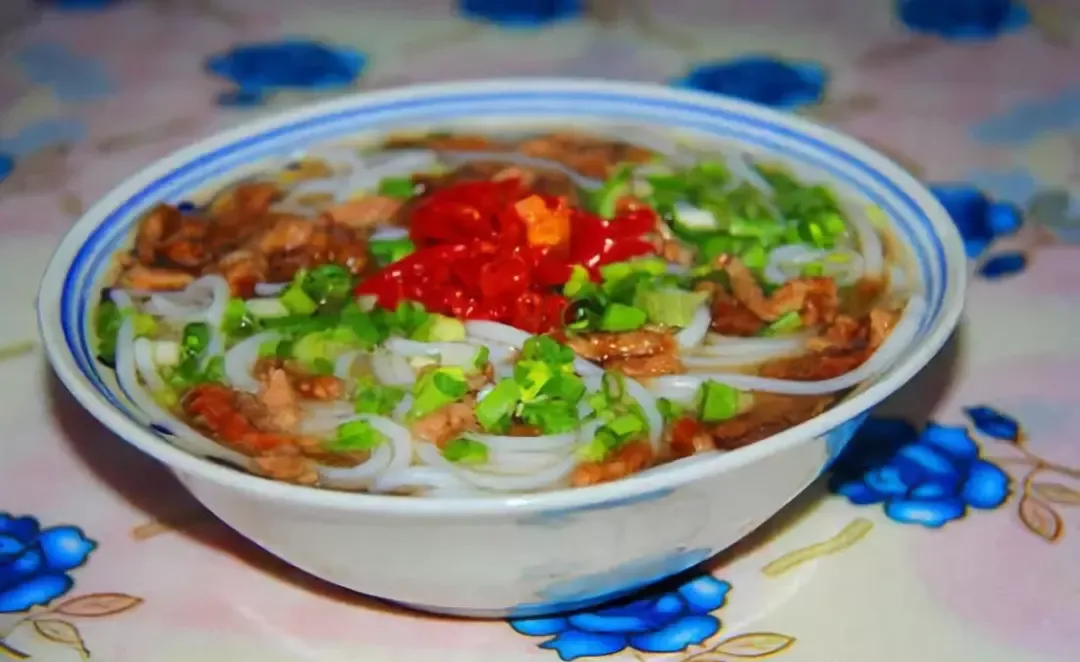 铅山烫粉是必须试的,这个粉不是煮的是烫的,米粉放在漏勺里,在开水锅里烫几秒钟,捞起来加辣椒、酱油、葱花、榨菜,搅匀了就能吃,听起来简单,但那个米粉的软硬度,辣椒的香度,酱油的咸度,三个东西配在一起的比例,每家店都不一样,你得自己去试,找到自己喜欢的那家。