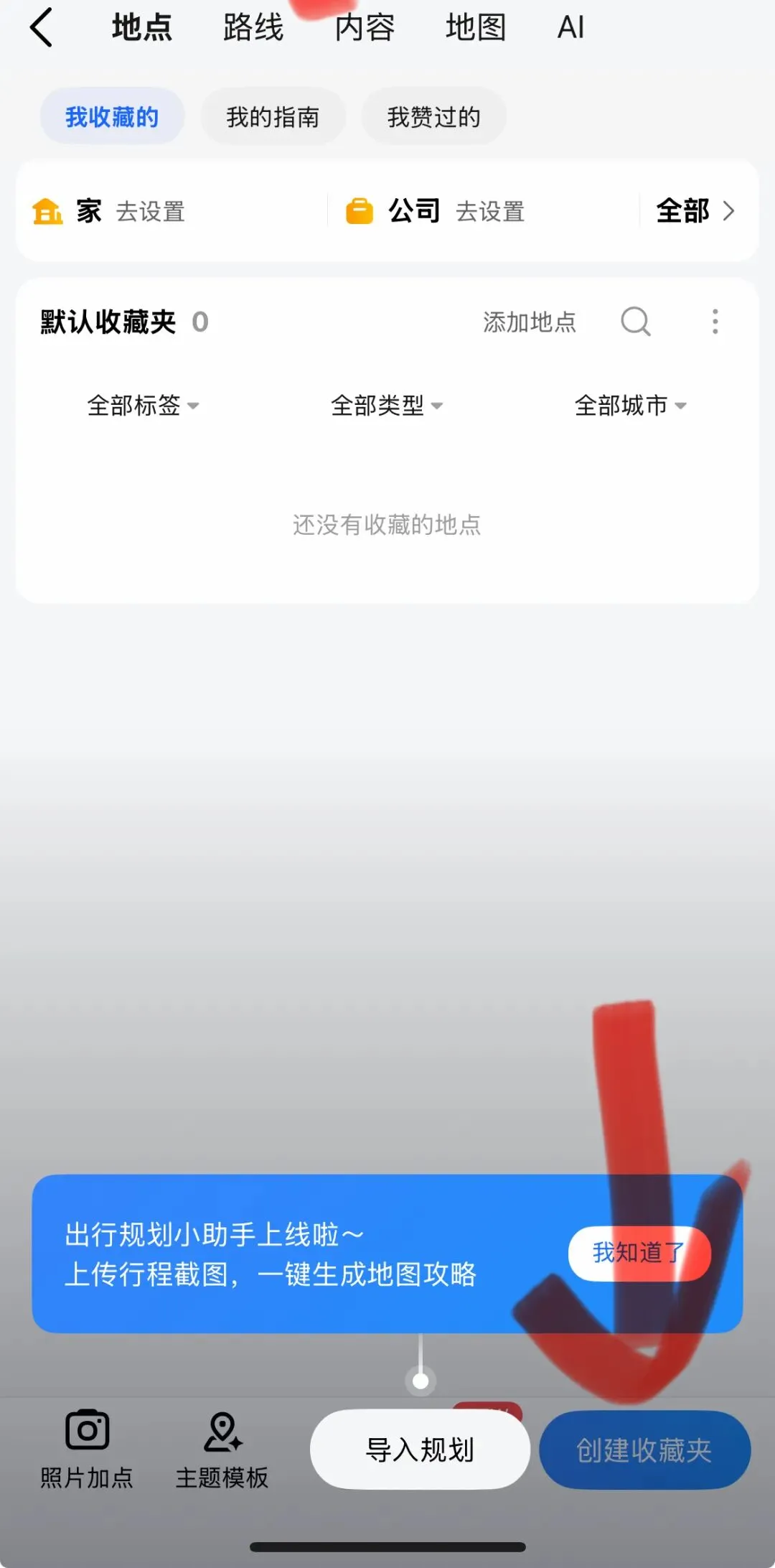 搜索框里输入你想去的景点、餐厅或酒店,然后点击“加入收藏夹