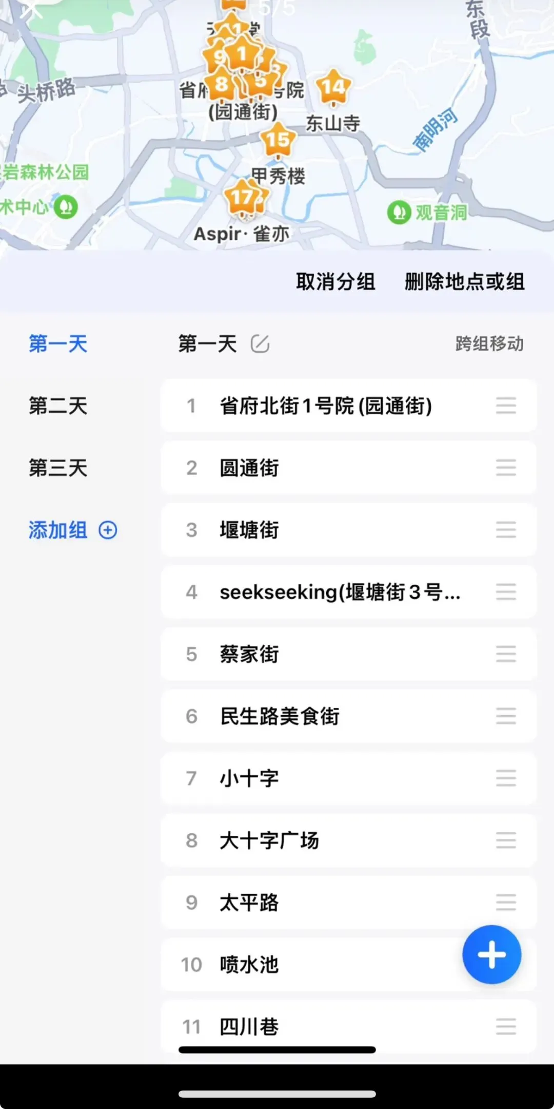 把所有想去的地方都加进去后,地图上就会显示出来。你可以根据位置远近,把距离近的点分到同一天。点击右上角的“组”可以创建分组,比如“第一天”、“第二天”,然后把对应的地点拖到相应的组里。