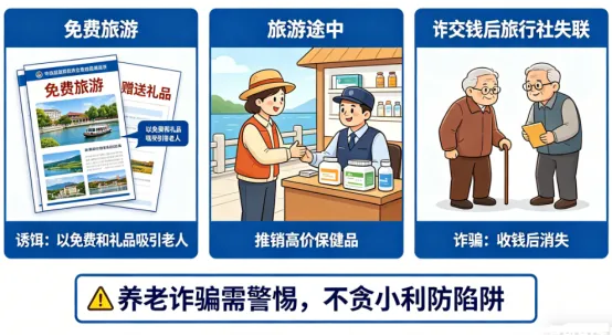 警惕以“分时度假会员”“旅游养老投资”“旅游+金融”等为名的新型骗局,此类骗局多承诺“免费旅游+年化收益”的旅游产品,尤其需警惕针对老年人组织的“健康讲座+免费旅游”“产品推介会”等名义的旅游活动,防范老年人权益受损。